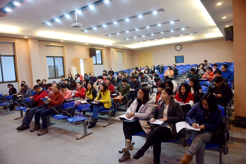 学生发展处主任郭在时带领考察团参观了校园。在逸夫图书馆学术报告厅,考察团兴致勃勃地观看了我校宣传片《荣光》,随后,陈迪勋作了题为《基于核心素养的学校德育》的专题报告,向考察团介绍了我校德育的整体情况和工作经验,详尽的资料、生动的讲述获得考察团成员一致好评。