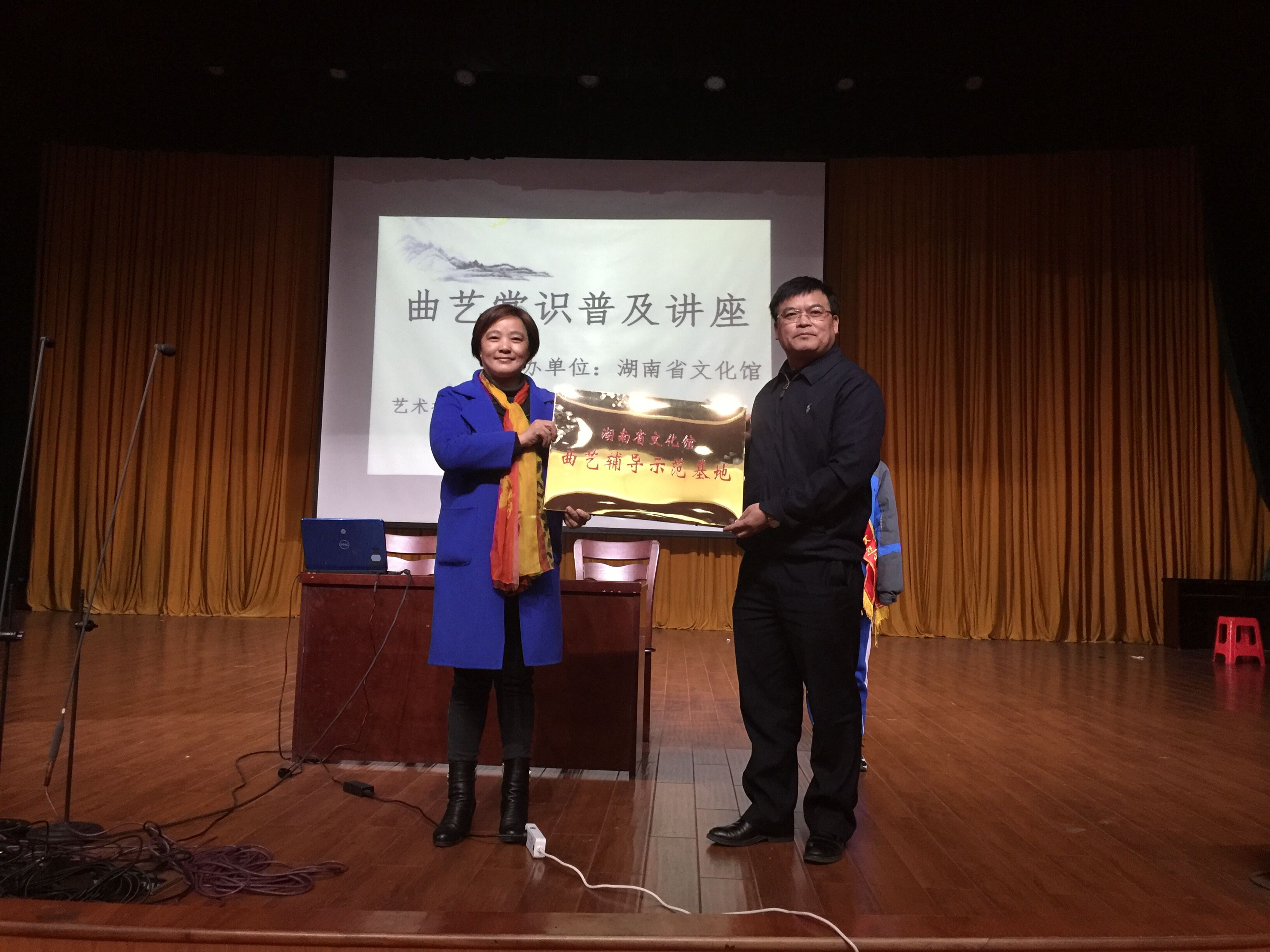 讲座开始前,校长谢永红与湖南省文化馆龙胜兰书记亲切会面,并合影留念。龙书记高度赞扬了我校的办学成绩和育人理念,并向我校授予了“湖南省文化馆曲艺辅导示范基地”牌匾。