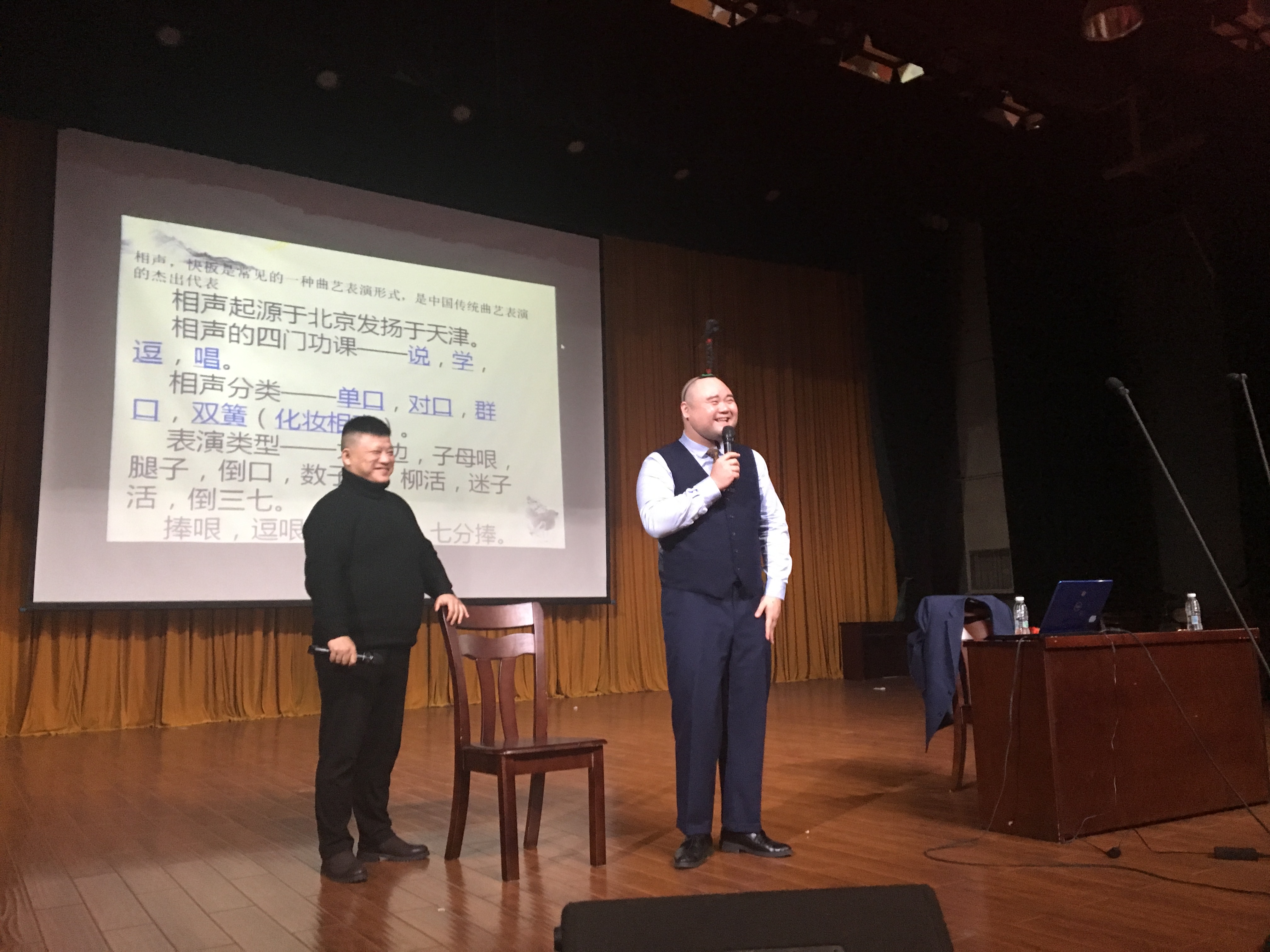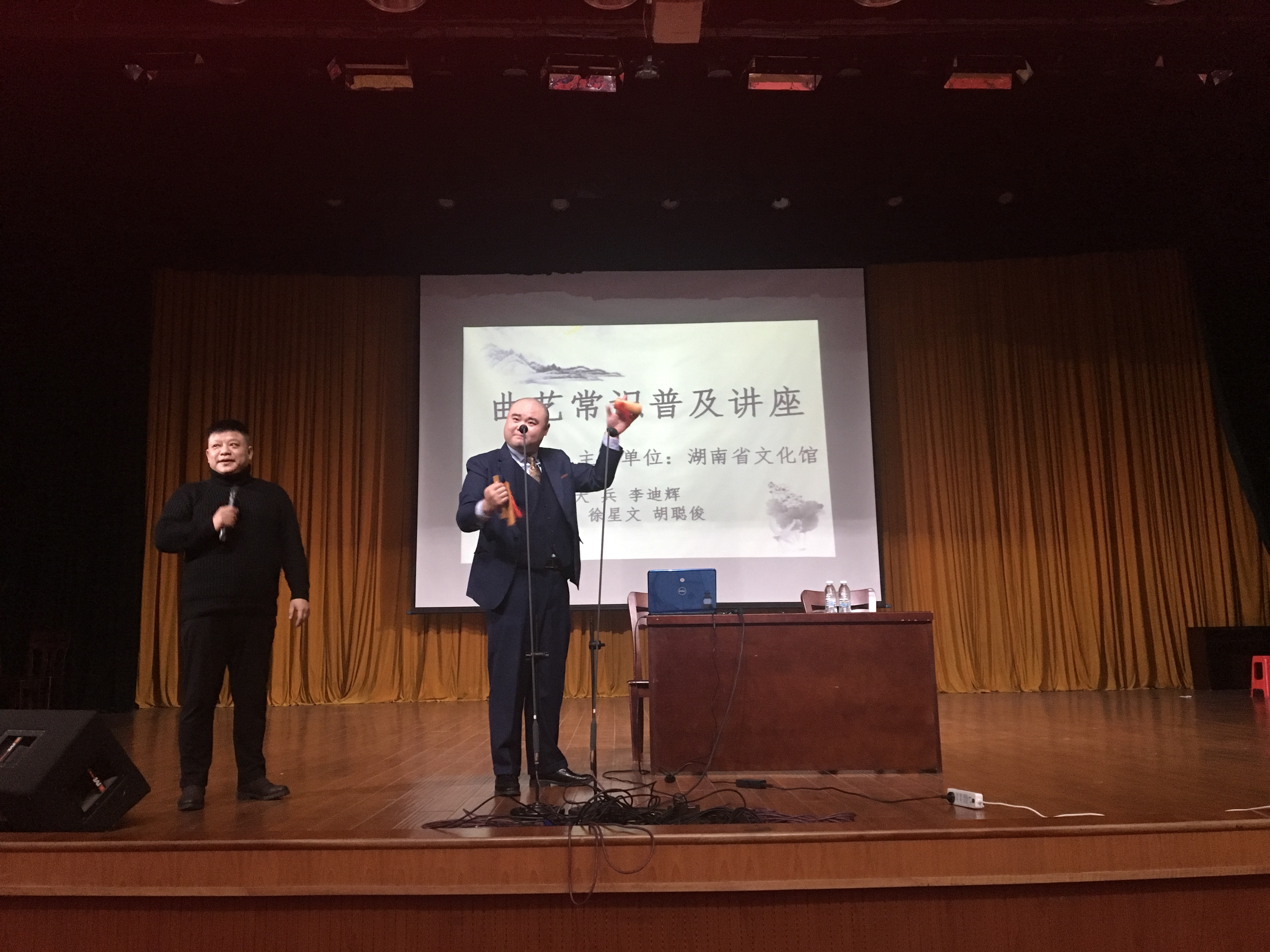 整场讲座内容丰富,贴近生活。我校优秀校友、著名青年相声演员胡聪俊、著名相声演员徐星文用边演边说的方式向大家详细的讲解了曲艺的基本知识以及湖南特有曲艺的形式。