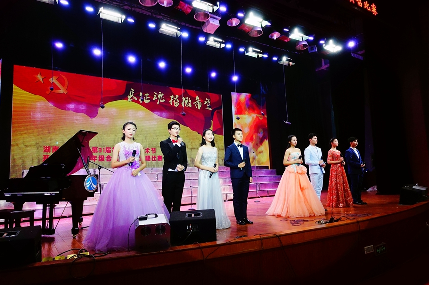 激昂的红歌,唱出了附中学子们高尚的爱国情怀;各班原创编写的班歌,唱出了同学们多彩的青春思绪,这也是本次合唱比赛的一大亮点。悠扬的乐曲,精致的服饰,流光溢彩的舞美,透露出的或是永不独行的友爱,或是对青春韶光的珍重,或是对五彩梦想的执着追求,抑或是傲立潇湘的豪情壮志,无一不展现高一同学们高昂的斗志与对未来生活的无限憧憬。各班积极向上的精神风貌,打动了在场的每一位观众;在编排班歌的过程中,各班形成了积极向上的班级理念与团结友爱的班级精神,我们多才多艺的高一学子在这过程中携手前进,共同茁壮成长。