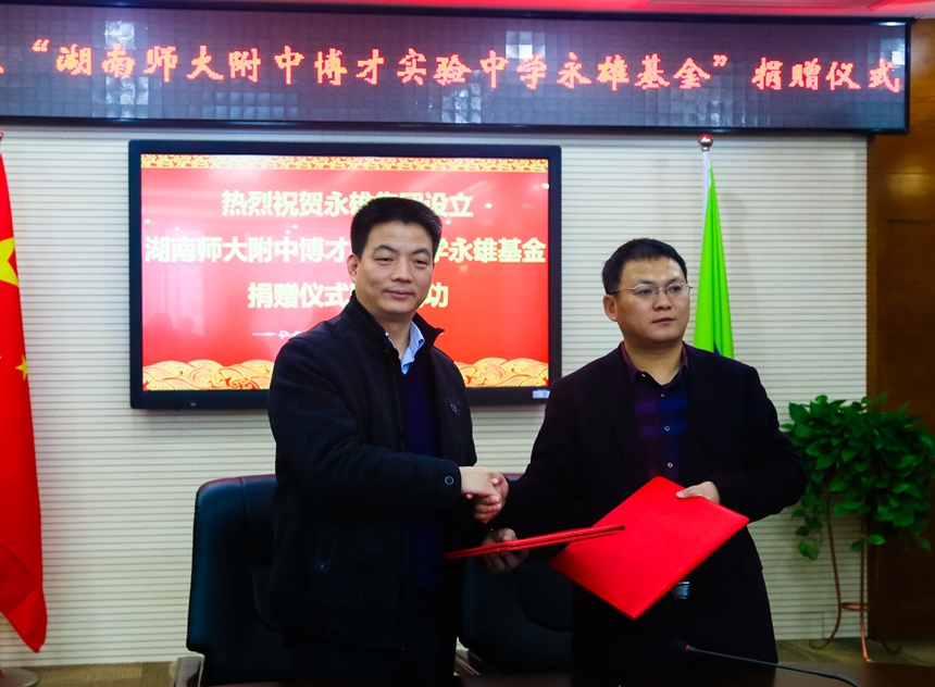 之后湖南永雄资产管理集团与湖南师大附中博才实验中学、湖南师大附中星城实验中学分别签订捐赠协议。