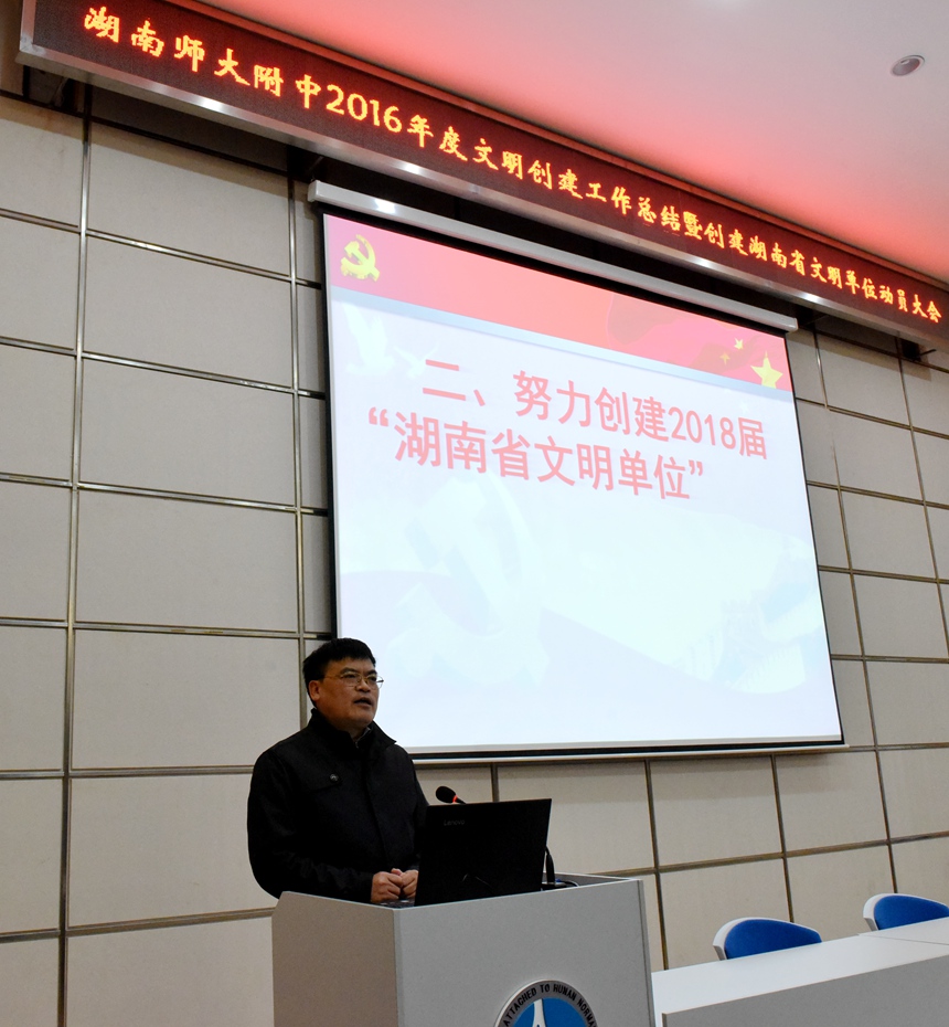 副校长陈迪勋代表学校文明创建工作领导小组回顾了学校2016年度文明创建工作,并对创建2018届湖南省文明单位作了动员和部署。