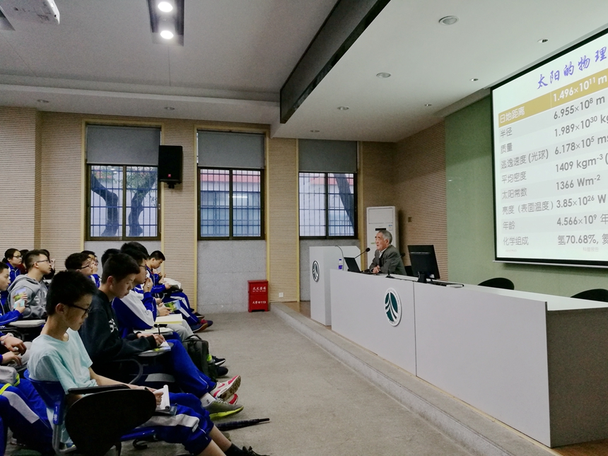 “自古以来,人们对于太阳的思考就没有停止过。”汪景琇院士带领同学们欣赏了日出美景的图片,赏析了屈原的诗作,带大家领略了太阳的美丽。“银河中三千亿颗恒星,太阳只是极其普通的一个。但是同学们要注意,越是普通,它越重要。为什么?因为你研究了太阳之后就会知道外面的恒星是什么样子的。它若是简单一个特例,那么也有意义,但是与这种很普通的恒星还是不大一样的。”