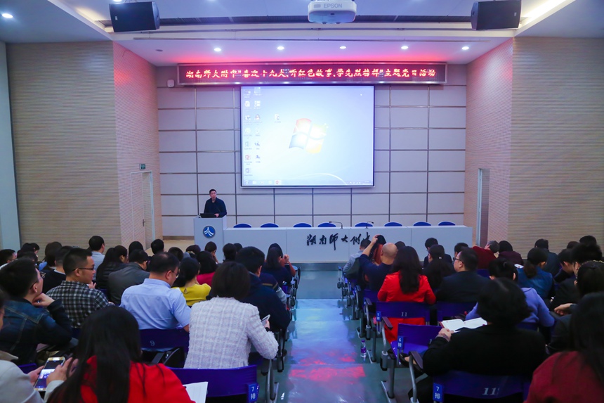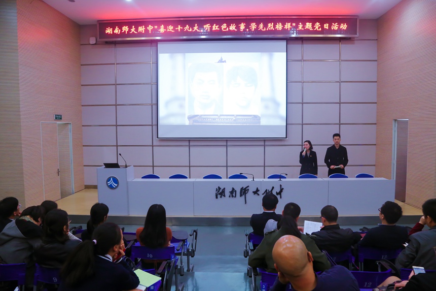 新闻中心 附中新闻 通知公告 最新动态 教育视点 集团学校新闻联播 媒体附中 工作安排 微信附中 学校党委集中开展“喜迎十九大、听红色故事、学先烈榜样”主题党日活动 发布:校办公室 来源:党委办公室 日期:2017-10-23 人气:分享到: 10月20日,在党的十九大召开之际,学校党委在会议厅组织全校教职工党员集中开展“喜迎十九大、听红色故事、学先烈榜样”主题党日活动。活动由学校党委办公室主任叶越冬主持。 叶越冬在活动开始前传达了师大党委和学校党委推进“两学一做”常态化制度化关于主题党日活动和 “三会一课”的相关要求,布置了学习廖俊波、黄大年先进事迹的相关工作。 湖南省党史陈列馆宣讲团讲解员谭丹、李霞、周密三位同志以党的光辉历程为背景,以“信仰的力量”为主题,分别讲述了革命、建设和改革阶段革命夫妻陈觉和赵云宵夫妇——《最后的嘱托》、抗日名将左权将军——《烽火岁月家国情》、伟大领袖毛泽东——《藏在衣柜里的情》、独臂将军贺炳炎——《共产党员的“硬骨头”》科学家陈能宽——《消失的25年》、扶贫楷模王新法——《扶贫路上的一座丰碑》等六个红色故事。讲解员声情并茂的叙述,屏幕上生动鲜活的影像,无时无刻不彰显着共产党人高尚情怀、浩然正气和信仰的力量。教职工党员们接受着心灵的净化和洗礼,情到深处,禁不住热泪盈眶。 活动结束后,校党委委员、副校长黄月初与校党委委员、副校长陈迪勋会见了宣讲团一行,对她们的精彩讲述表示感谢,并就学校与省党史陈列馆进一步加强合作事宜进行了交流。 (供稿人 叶越冬) 上一篇:我校教学开放日精彩纷呈,吸引来自全国的千余名同行观摩 下一篇:谢永红随团出访北美并会见我校校友 通知公告 更多 关于征集湖南师大附中“十五五” 湖南师大附中2026年教师招聘(第 湖南师大附中2025年教育教学成果 湖南师范大学附属中学2025年零星 关于举办第40届校园文化艺术节的 湖南师范大学附属中学2026年教师 最新动态 更多