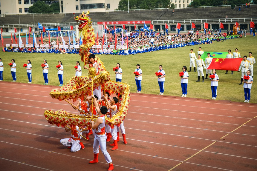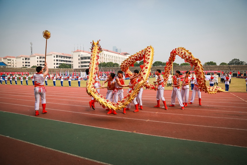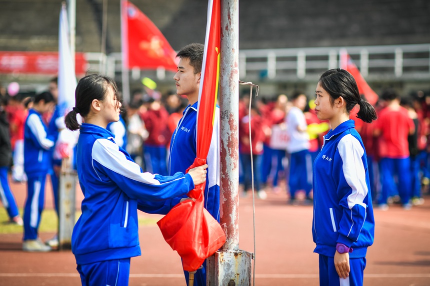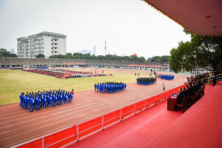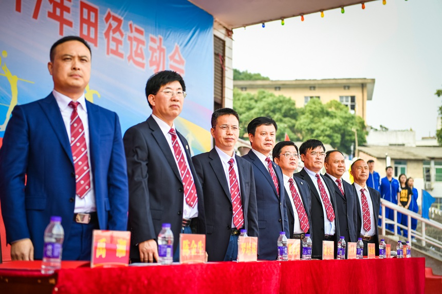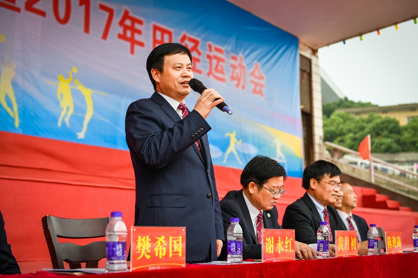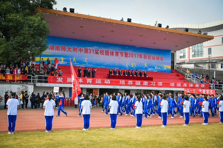 在完成了校学生会主席禹湘致辞、总裁判长佘杰明宣布赛会纪律、运动员代表李丹和裁判员代表余秀雄宣誓等议程后,组委会主任谢永红宣布湖南师大附中第31届校园体育节田径运动会开幕。