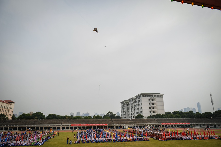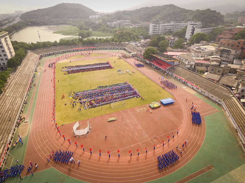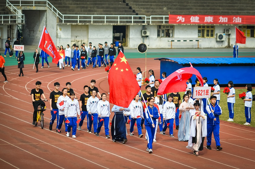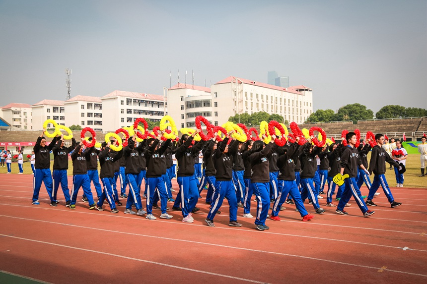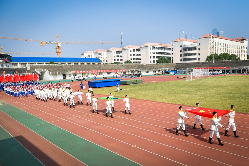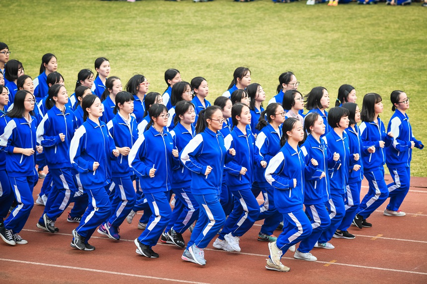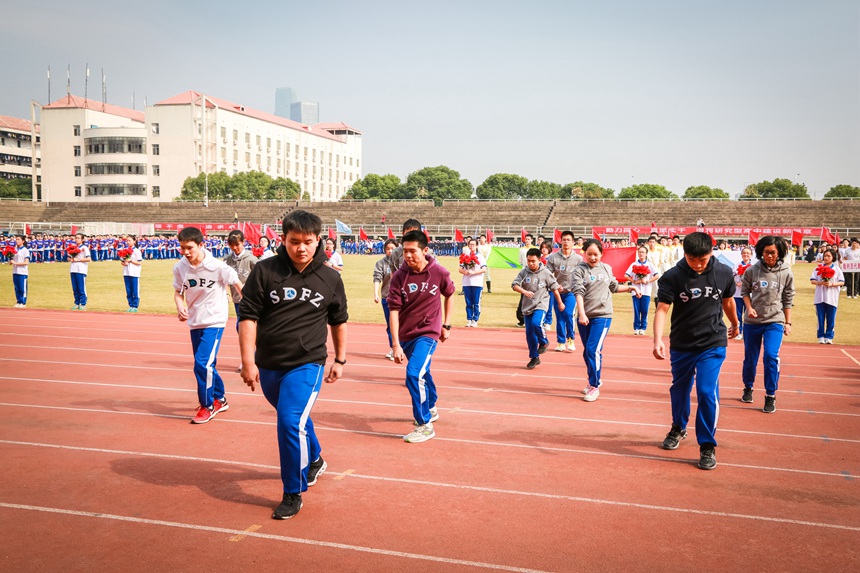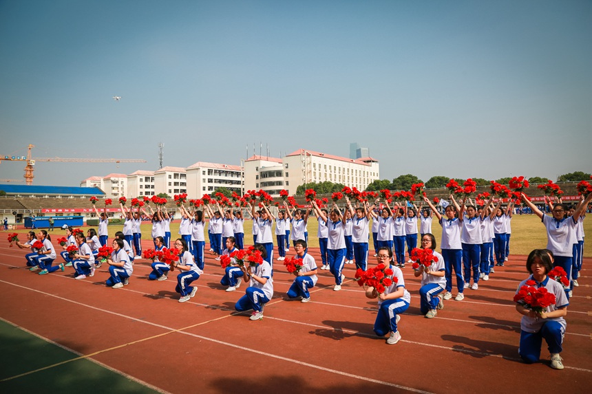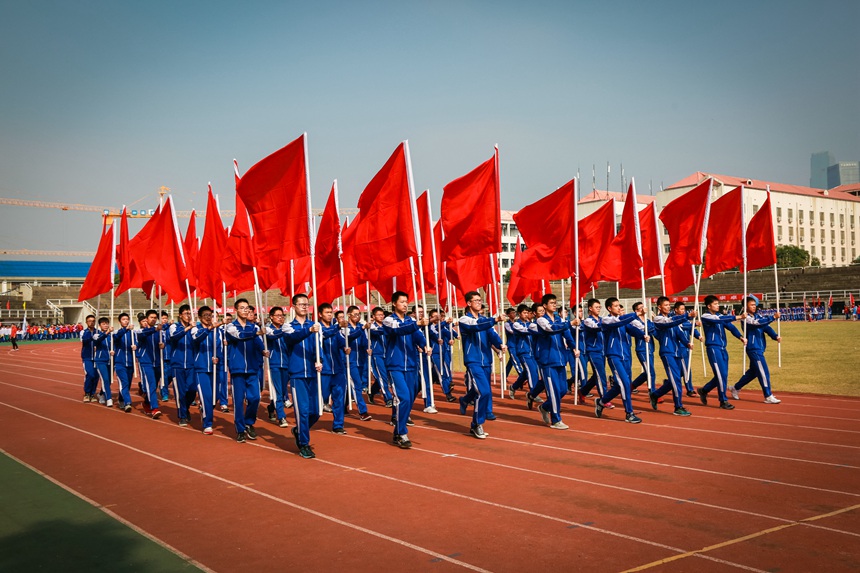 接下来,学生代表进行了特色展示活动。学校武术模块选修班的同学们带来了气势磅礴的武术表演;航模队的表演精彩纷呈,三架航模在操场上空进行了各种穿越、盘旋、队列的变化,让人看得心潮澎湃。更让人激动的是高三年级全体班级的跑操展示,20个班级的同学步伐一致、队形整齐,口号响亮,他们的精彩表现赢得了现场师生的阵阵掌声。
