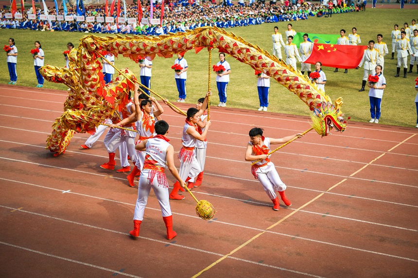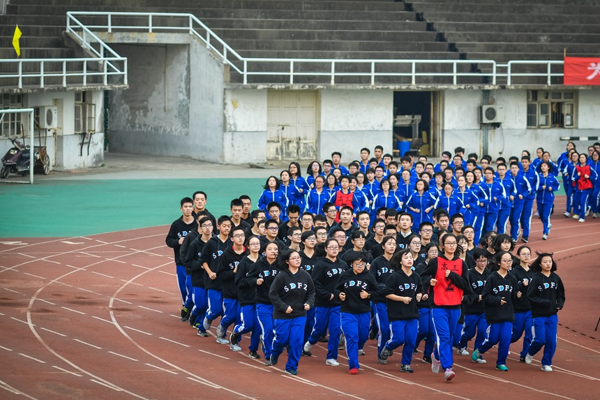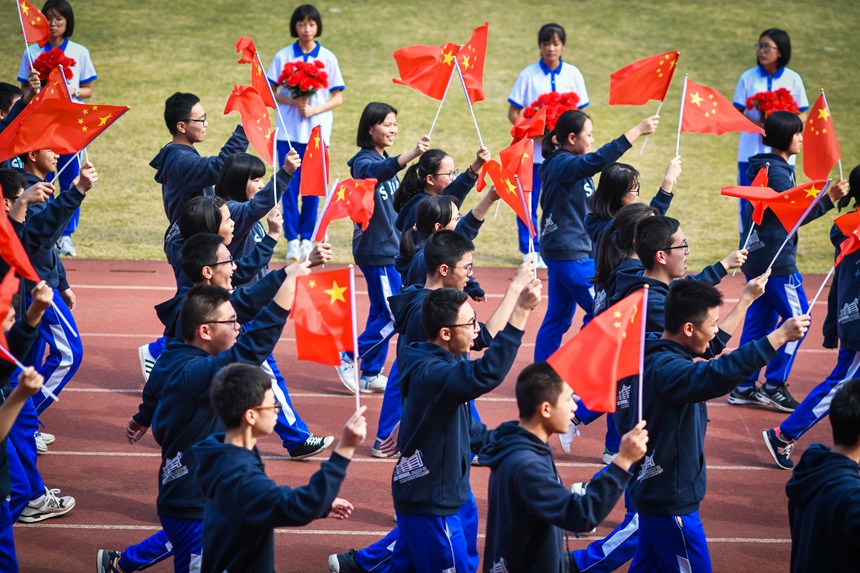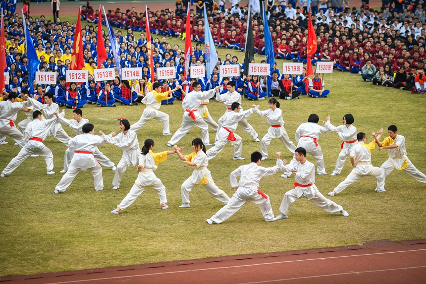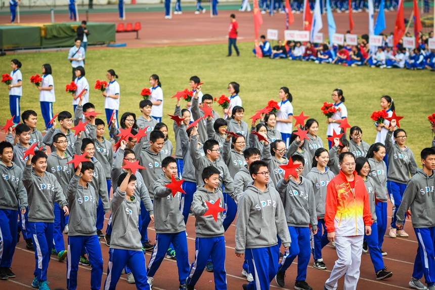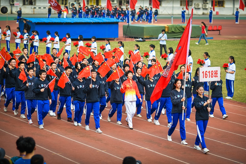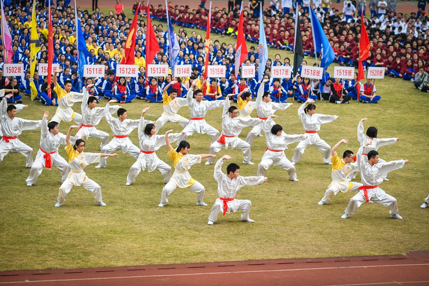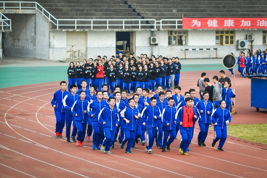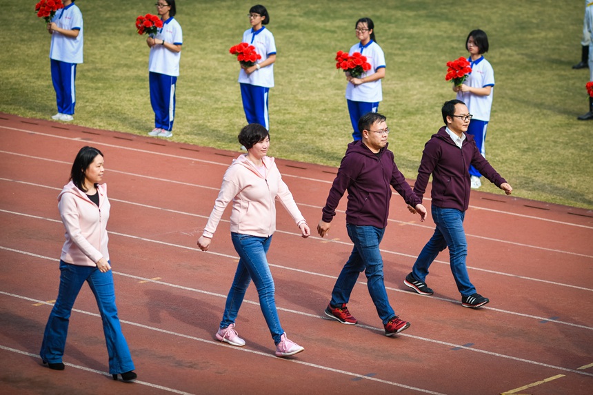 接下来,学生代表进行了特色展示活动。学校武术模块选修班的同学们带来了气势磅礴的武术表演;航模队的表演精彩纷呈,三架航模在操场上空进行了各种穿越、盘旋、队列的变化,让人看得心潮澎湃。更让人激动的是高三年级全体班级的跑操展示,20个班级的同学步伐一致、队形整齐,口号响亮,他们的精彩表现赢得了现场师生的阵阵掌声。