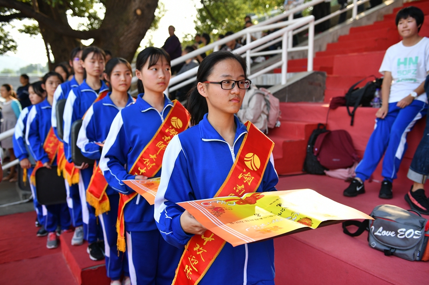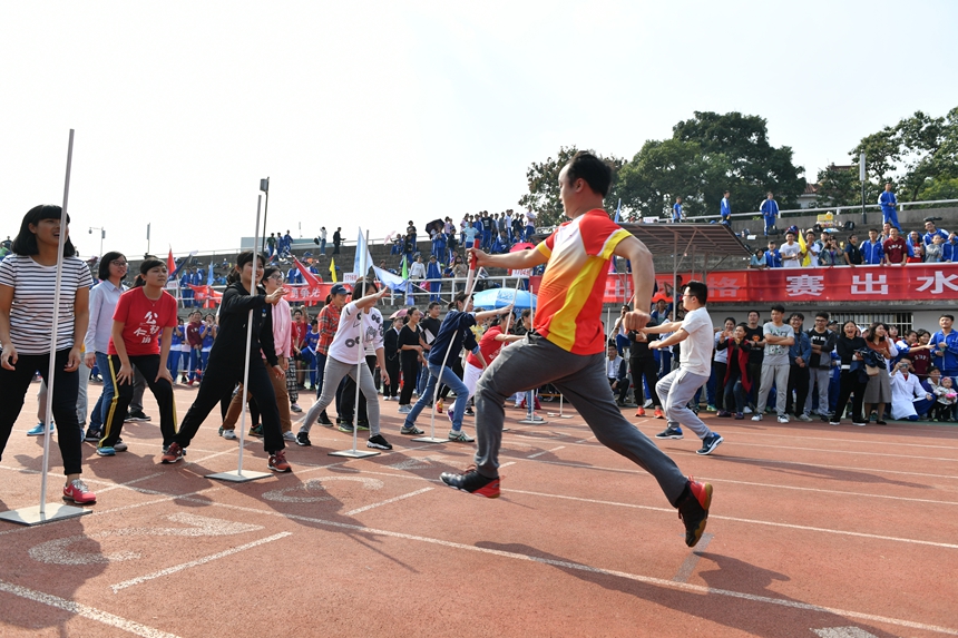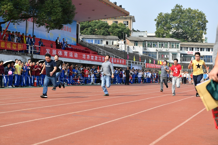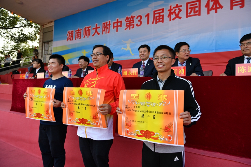 总裁判长佘杰明老师宣布了竞赛成绩,领导和嘉宾为获得教职工50米迎面接力前三名、各年级团体总分前八名以及精神文明奖的集体颁奖。