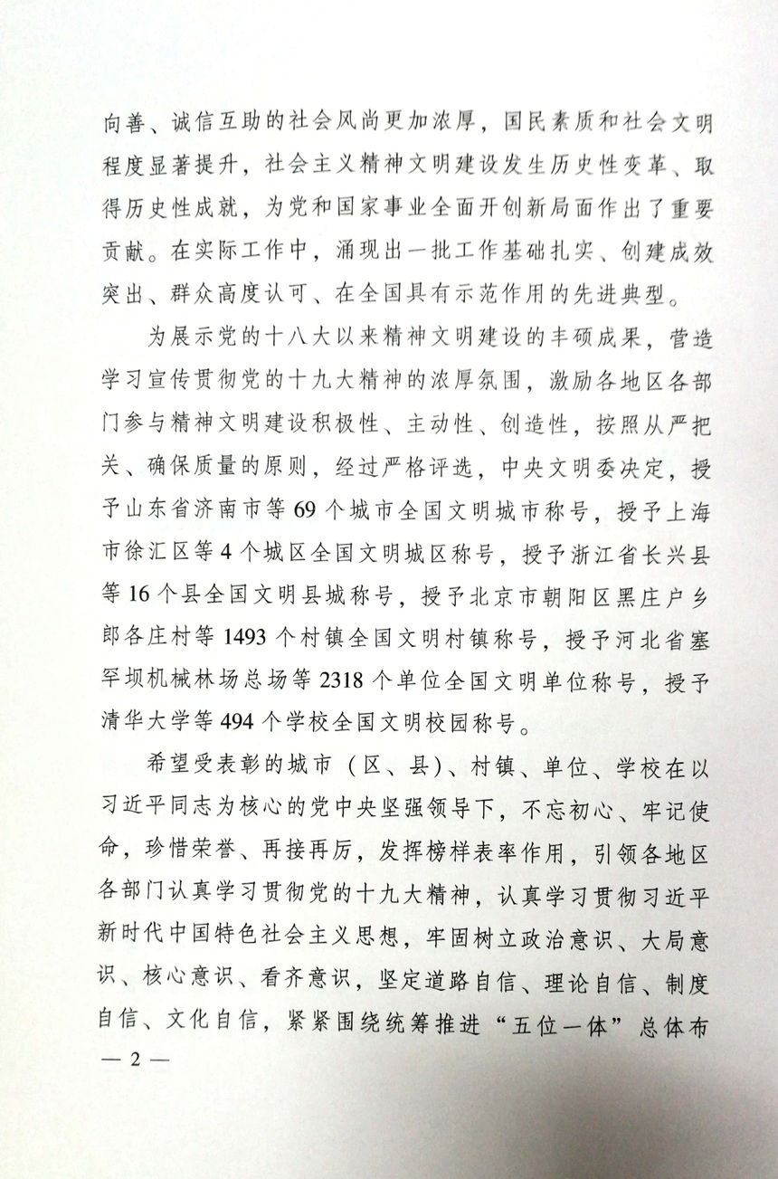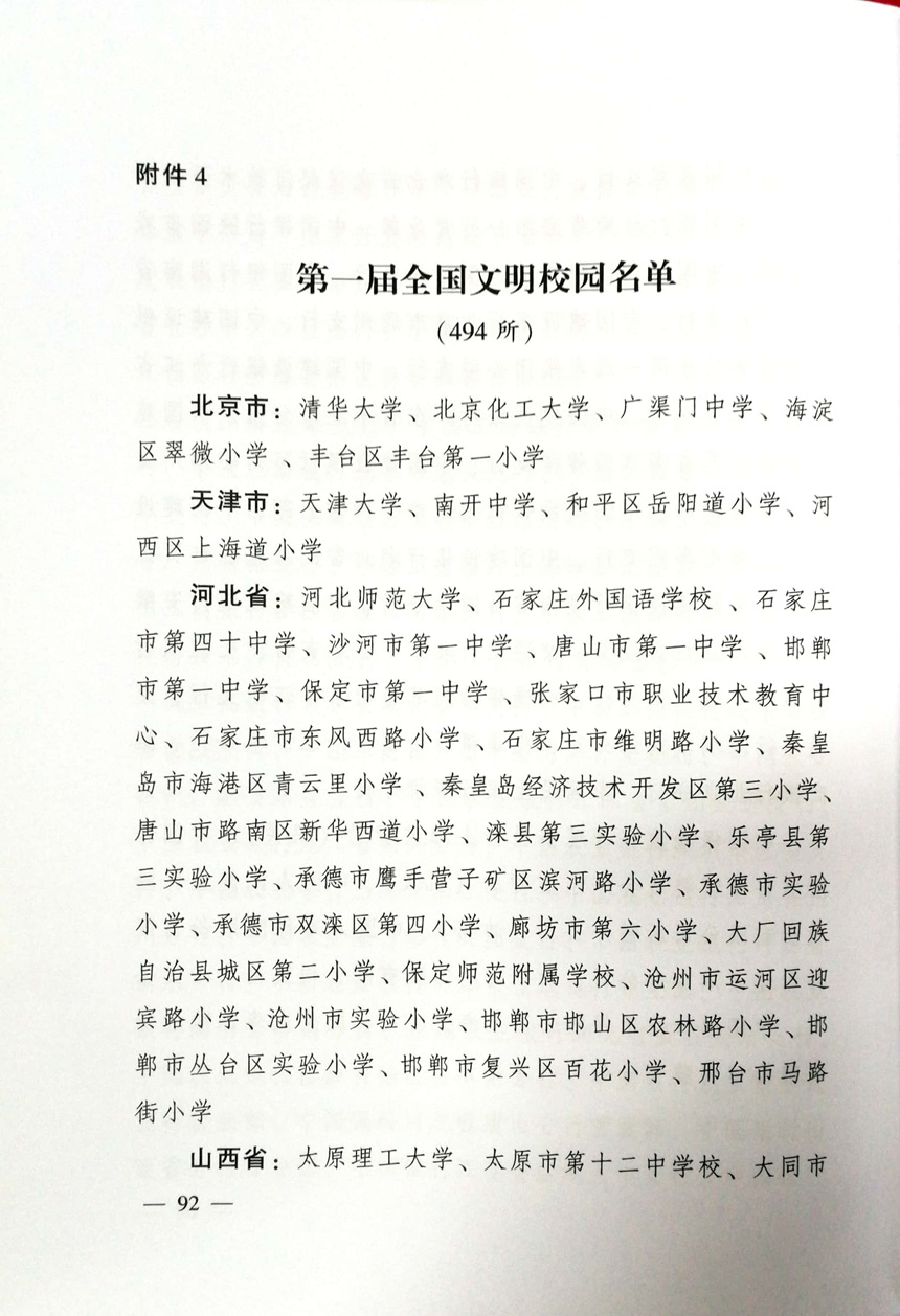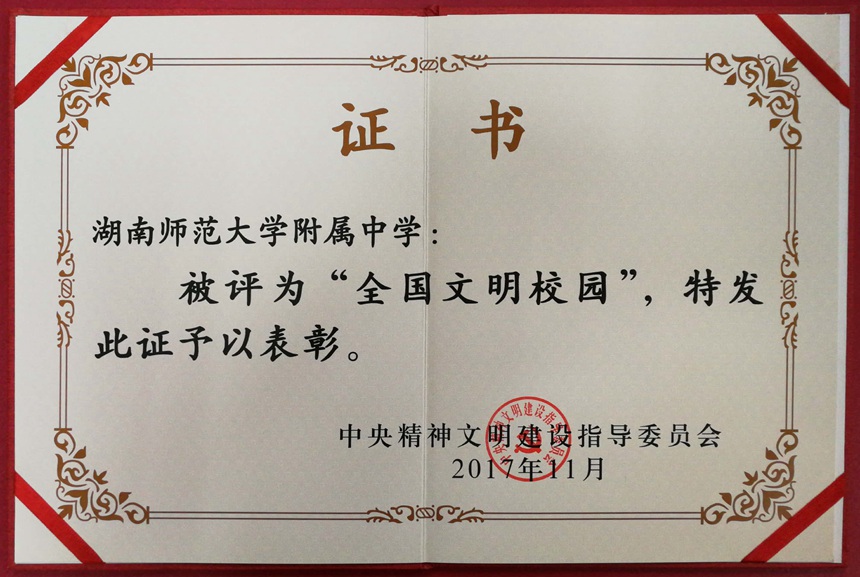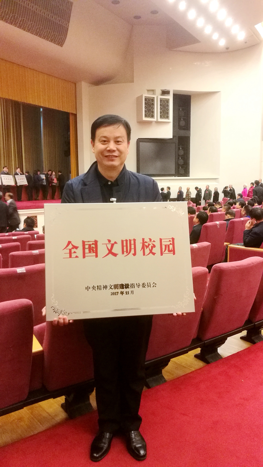 为积极培育和践行社会主义核心价值观,充分展示学校精神文明建设成果,根据中央文明委工作安排,今年评选表彰第一届全国文明校园。2017年7月份以来,各地广泛动员,组织各级各类学校积极参与,经过自愿申报、复查审核、遴选公示等环节,推出了一大批创建工作基础扎实、成效显著的大中小学校。中央文明办会同教育部对照文明校园“六个好”的创建标准,严格审核、优中选优,推荐495所学校作为第一届全国文明校园候选单位,其中,高校39所、中学160所、小学296所。我校光荣上榜,被评为第一届全国文明校园。今年8月以来,短短三个月里,我校先后被评为全国群众体育先进单位和首届全国文明校园,谢永红校长两次得到习近平总书记的亲切接见。