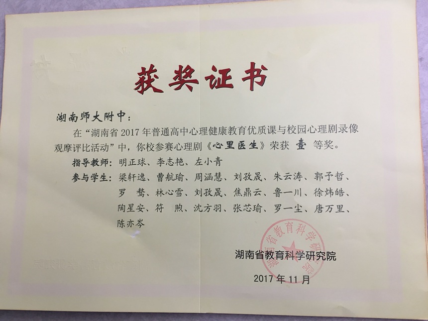 最后,省教科院课程研究室主任、心理学教研员贺彩云宣布了2017年湖南省校园心理剧录像观摩评比获奖名单,我校《心里 医生》《梦境旅人》分别获一、二等奖。