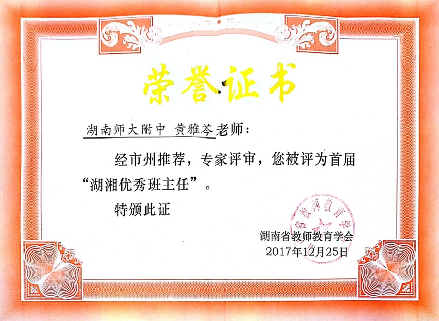 黄雅芩老师荣获湖南省首届“湖湘优秀班主任”光荣称号