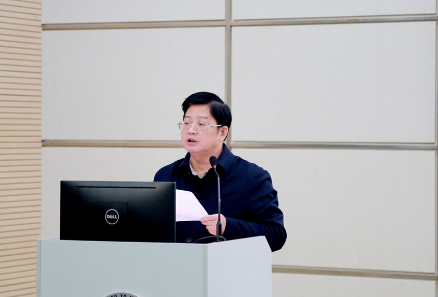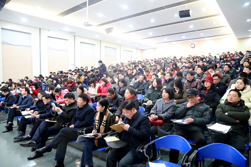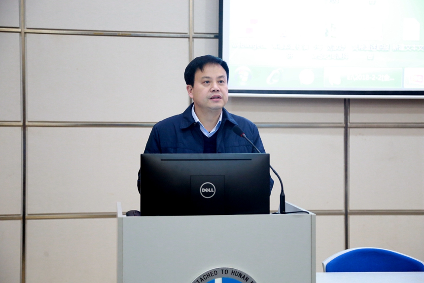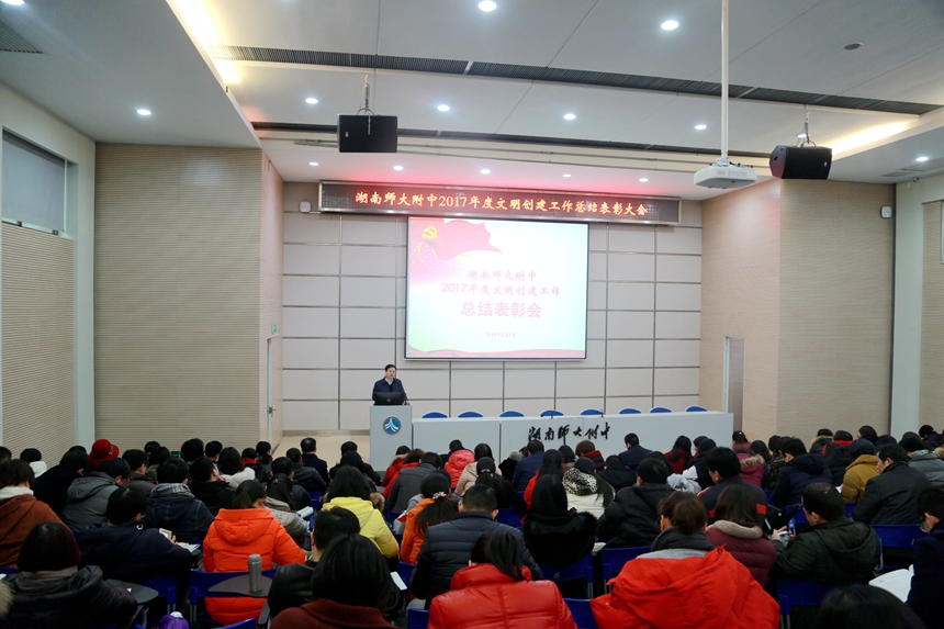陈迪勋代表学校文明创建工作领导小组回顾总结了学校2017年度在“省直机关文明标兵单位”的建设、第一届“全国文明校园”的成功创建和长沙市“全国文明城市”复评工作中取得的成绩,介绍了“全国文明校园”日常创建的六个方面的内容,分享了2017年文明创建工作中的典型事迹。他强调文明创建工作永远在路上,并在提醒全校教职工在创建工作中的注意事项后,号召大家积极配合、共同参与学校将于2018年全面启动的文明创建评比工作。