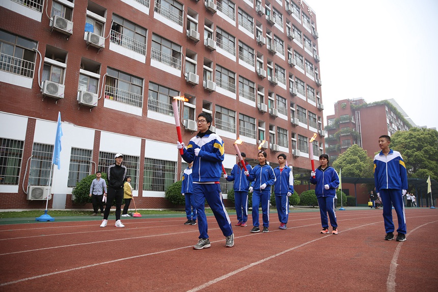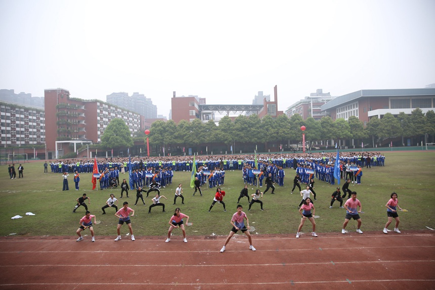 随后,火炬传递仪式启动。各集团校学生火炬手依次传递运动会圣火,绕场一周,与总裁判长佘杰明一道,共同点燃位于主席台左侧的火盘。广益实验中学舞蹈队和羽毛球队精彩的演出,将开幕式推向了高潮。田径场上洋溢着欢快动感的气氛。