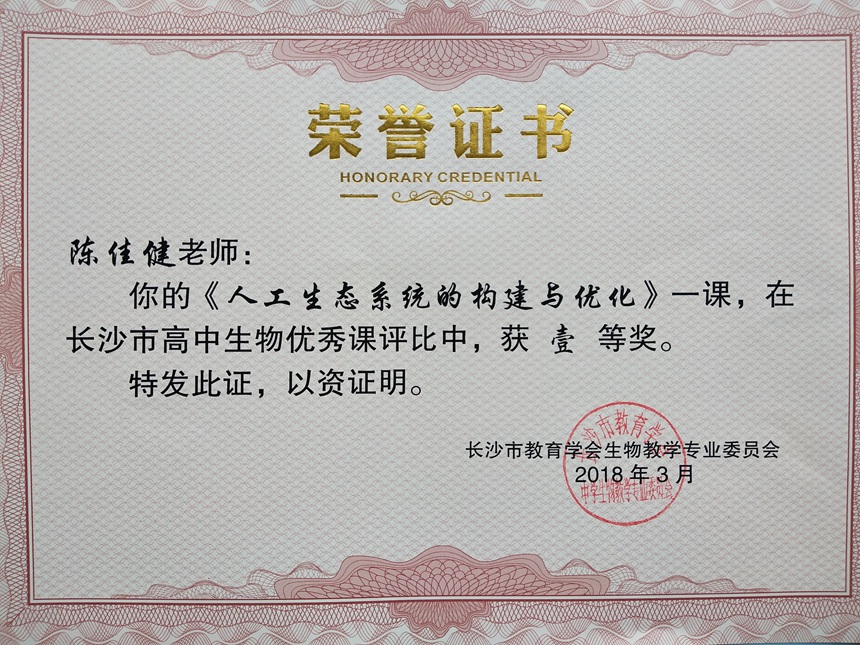 陈佳健老师获长沙市高三生物研讨会教研示范课一等奖