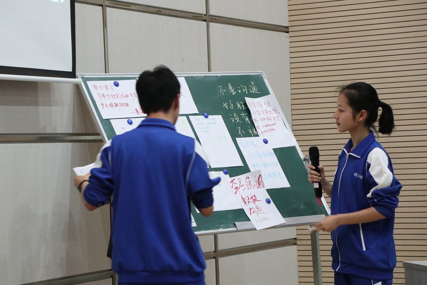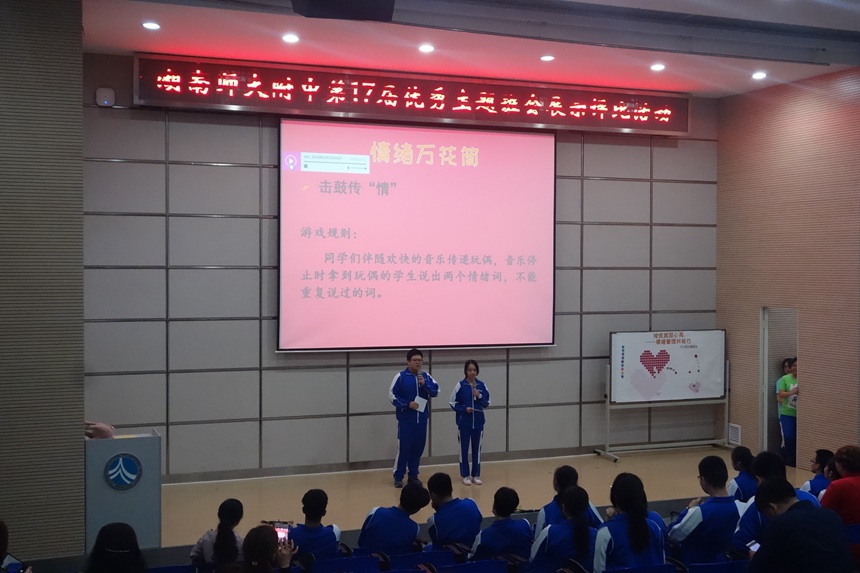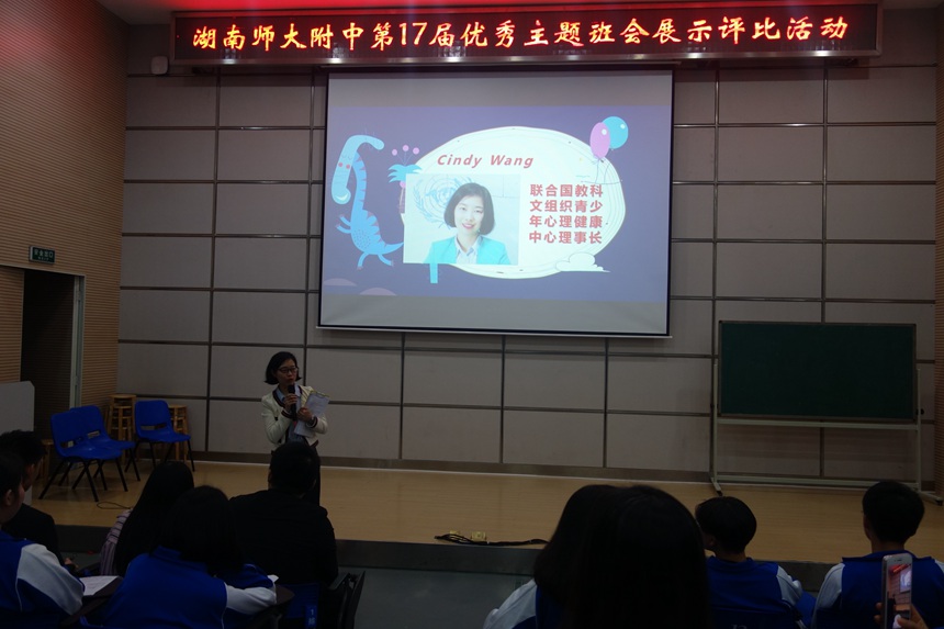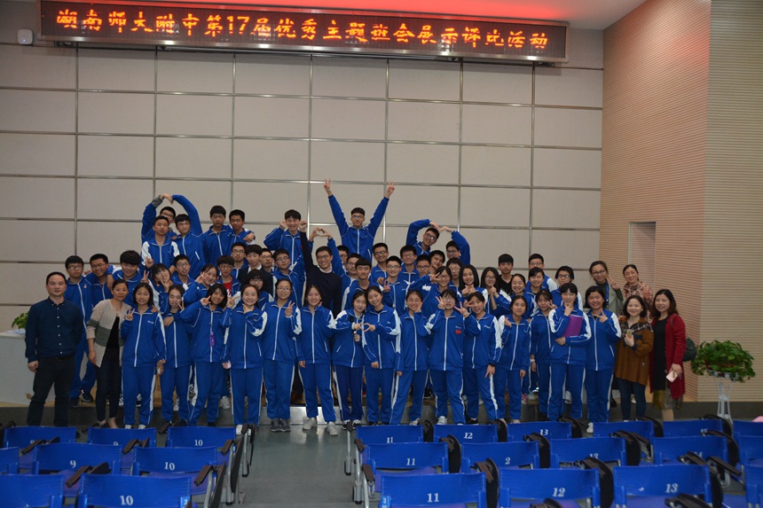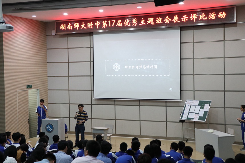 刘雄昆老师带领1713班同学展示了主题班会《解忧杂货店—写给青春的信》,张光新老师带领1704班同学展示了主题班会《孤独之旅·成长之旅》,吴浩老师带领1706班同学展示了主题班会《我想有个家》,彭如倩老师带领1709班同学展示了主题班会《滚蛋吧,挫折君!》,王心怡老师带领1721班同学展示了主题班会《修炼美丽心灵—情绪管理我能行》,明正球老师带领1714班同学展示了主题班会《爱你在心口难开—探讨家庭交流的正确打开方式》,谭天俊老师带领1722班同学展示了主题班会《认识自我,实现自我》,欧阳普老师带领1613班同学展示了主题班会《沟通从心开始》,罗娟老师带领1621班同学展示了主题班会《生态文明教育—只有一个地球》。九堂班会课内容丰富多彩,紧扣主题,具有时代感,震撼了学生心灵,充分发挥了主题班会育人功能。