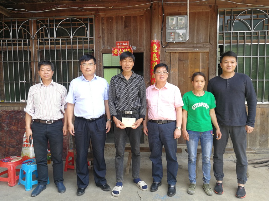 在我校结对帮扶对象苏知平家,黄月初仔细察看他们的居住环境,详细询问了苏知平的病情和他们的生活现状,共同商讨其发展生态养殖的脱贫计划,并送上了慰问金和慰问物资,祝愿他们全家身体健康,早日脱贫。