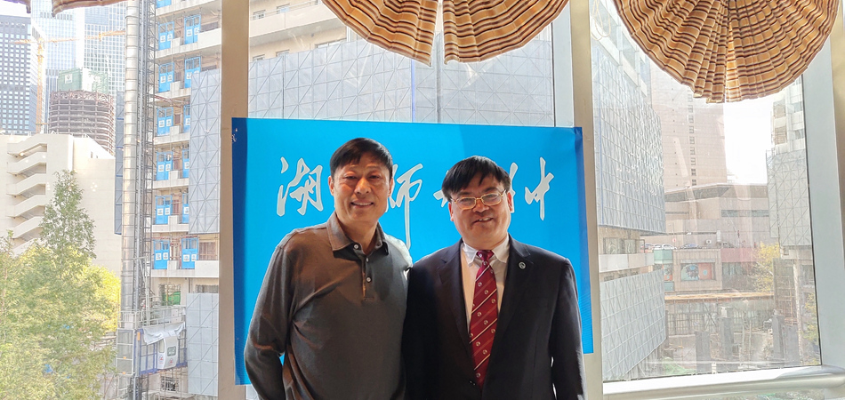 陈迪勋代表学校向承伟会长授予湖南师大附中北京校友会会旗。