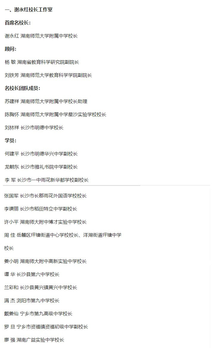 新闻中心 附中新闻 通知公告 最新动态 教育视点 集团学校新闻联播 媒体附中 工作安排 微信附中 【长沙晚报】长沙新增谢永红等9个名校长工作室 发布:校办公室 来源:校办公室 日期:2018-11-29 人气:分享到: 11月28日,长沙市第二批中小学名校长工作室授牌仪式在长沙市教育局举行,我校校长谢永红等9位中小学校长成为长沙市名校长工作室首席名校长。 原文链接 上一篇:长沙市名校长工作室谢永红校长工作室授牌 下一篇:我校第三届“亲近专业·预见未来”专业深度分享活动成功举办 通知公告 更多 关于征集湖南师大附中“十五五” 湖南师大附中2026年教师招聘(第 湖南师大附中2025年教育教学成果 湖南师范大学附属中学2025年零星 关于举办第40届校园文化艺术节的 湖南师范大学附属中学2026年教师 最新动态 更多