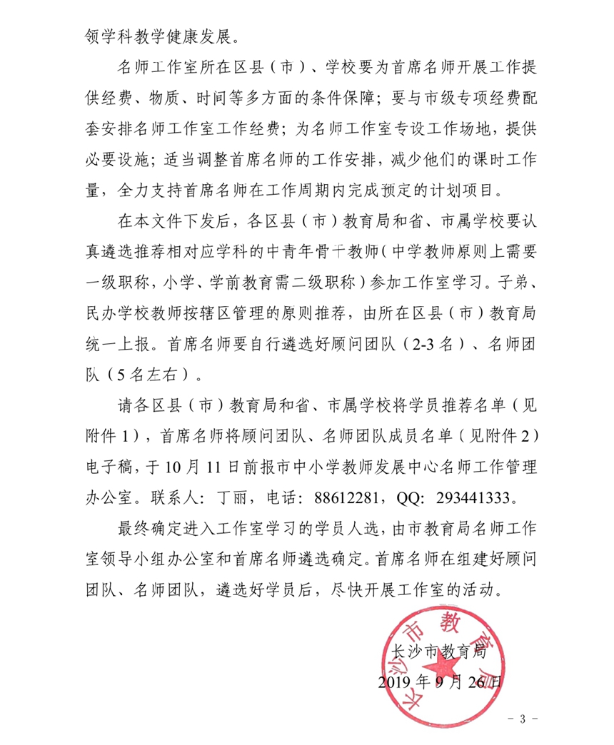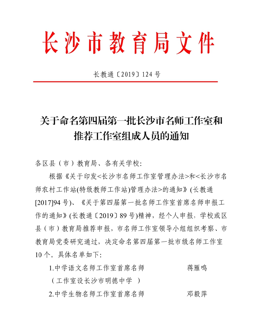 新闻中心 附中新闻 通知公告 最新动态 教育视点 集团学校新闻联播 媒体聚焦 工作安排 微信附中 我校赵优良老师被遴选为长沙市中学数学名师工作室首席名师 发布:管理员 来源:未知 日期:2019-10-12 人气:分享到: 根据长沙市教育局 《关于第四届第一批名师工作室首席名师申报工作的通知》(长教通〔2019〕89号)、《关于命名第四届第一批长沙市名师工作室和推荐工作室组成人员的通知》(长教通〔2019〕124 号),经个人申报,学校推荐,长沙市名师工作室领导小组组织考察、长沙市教育局党委研究通过,决定命名第四届第一批市级名师工作室10个。其中,我校赵优良老师被遴选为中学数学名师工作室首席名师(工作室设湖南师大附中)。 第四届第一批名师工作室的工作时间从2019年9月27日起至2022 年9月26日止。名师工作室的主要任务是:充分发挥名师的引领、带动和辐射作用,培养、培训中青年骨干教师,开展教育教学重点问题研究,加强学科教学科研团队建设,破解学科教学难题,引领学科教学健康发展。 此前,我校先后有梁良樑(地理)、张宇(数学)、肖鹏飞(化学)三位老师被遴选为长沙市名师工作室首席名师。 (供稿:周琼) 上一篇:学校党委举行理论学习中心组(扩大)专题学习会暨主题教育管理干部读书班活动 下一篇:学校第33届校园体育节暨田径运动会开幕式隆重举行 通知公告 更多 湖南师范大学附属中学2024年度废 湖南师范大学附属中学化学实验室 湖南师范大学附属中学出国(境) 关于开展2024年暑假教科研论文评 湖南师范大学附属中学2024年暑假 关于申报“十四五”课题2024年度 最新动态 更多