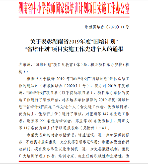 2019年度,我校先后承办了“省培计划(2019)”——高中生涯规划教育省级骨干教师研修(S204),“省培计划(2019)”——普通高中新课程新高考省级骨干教师培训(S201-2高中数学),“省培计划(2019)”——普通高中新课程新高考省级骨干教师培训(S201-9高中地理)等多个培训项目,培训湖南省各地骨干教师近200人次。承办过程中,黄月初、向超、李志艳等老师发扬主人翁精神,勇于担当,智慧付出,为各项培训活动的有序和有效开展作出了突出贡献。