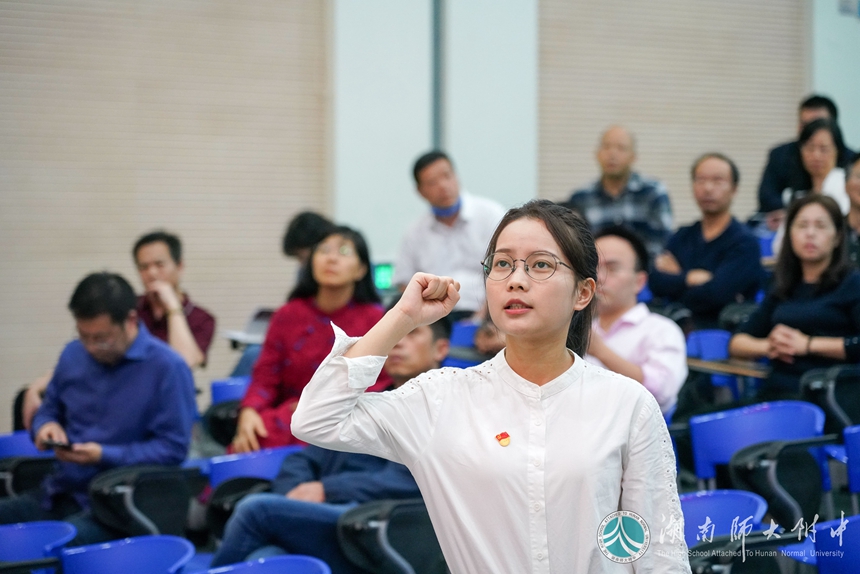 新教师代表罗晓雯老师表示,要争做具有良好师德修养、有扎实专业功底、有无私奉献的爱心和不畏挑战的好老师。刘文哲老师本是附中优秀校友,他谈到,自己放弃百万年薪回母校任教是为了追寻自己的初心,他希望用自己的努力、见识,去培养更多高素质、对社会有贡献的人,“今后桃李满天下的幸福感与成就感,远比金钱更可贵”。