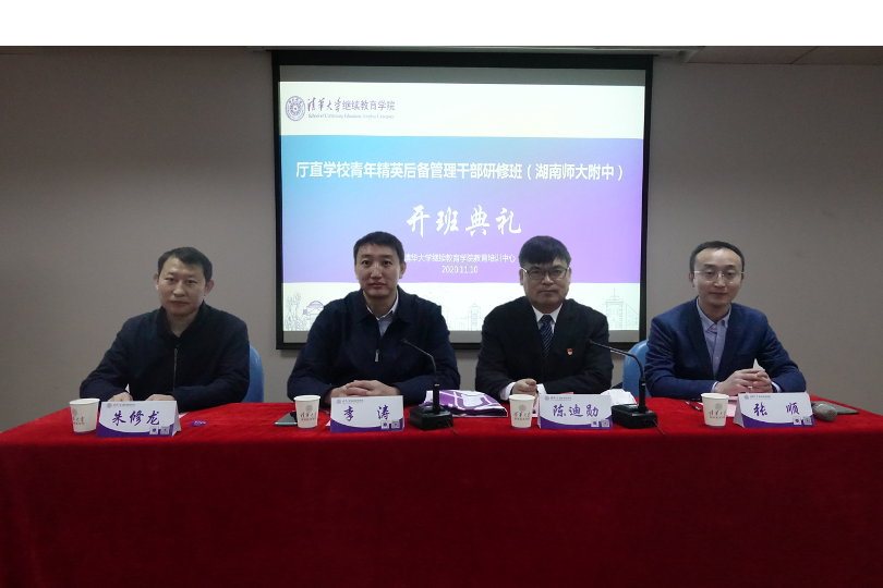 开班仪式由清华大学教育培训中心项目主任张顺主持。清华大学继续教育学院教育培训中心副主任李涛、湖南师大附中副校长兼工会主席陈迪勋等领导出席。李涛致欢迎辞,他介绍了清华大学的办学历程和学校文化,提出了全体学员于清华有所得、于老师有所得、于同学有所得等三点期望,表达了对附中与清华再次合作的信任与感谢之情。 陈迪勋作动员讲话。他强调了此次培训的不易,希望我们珍惜学习的机会、珍惜与同事成为同学的机会,转变角色,积极互动,认真学习,严格考勤,提出了遵守疫情防控的要求,预祝培训活动取得圆满成功。