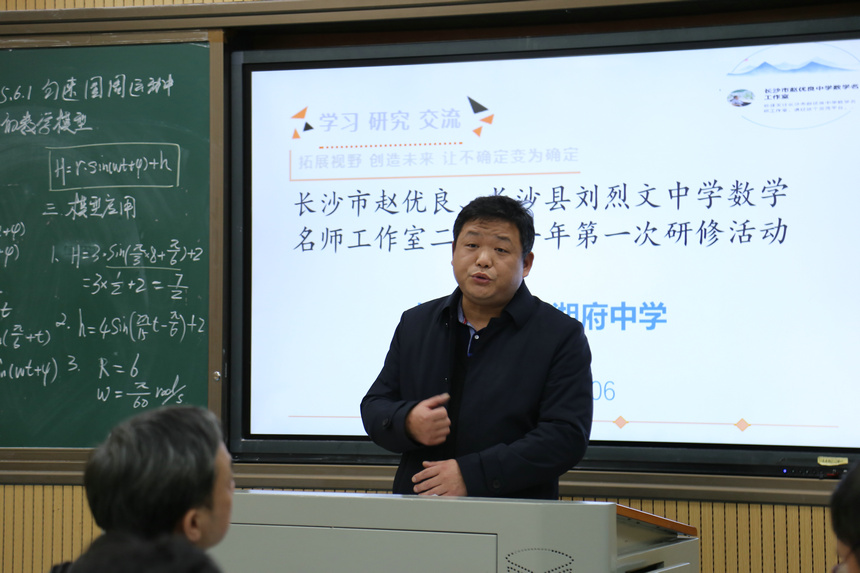长郡湘府中学杨万维校长发言。杨校长代表学校对赵优良名师工作室成员的到来表示热烈欢迎,他结合自身的专业发展和工作经历谈到对数学教师专业发展的责任与担当,让工作室全体成员倍感温馨。
