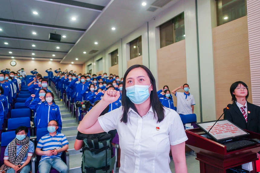 与会领导、老师为新团员颁发团员证、佩戴团徽。团委副书记温宇带领全体新团员在团旗下庄严宣誓。