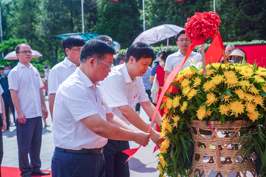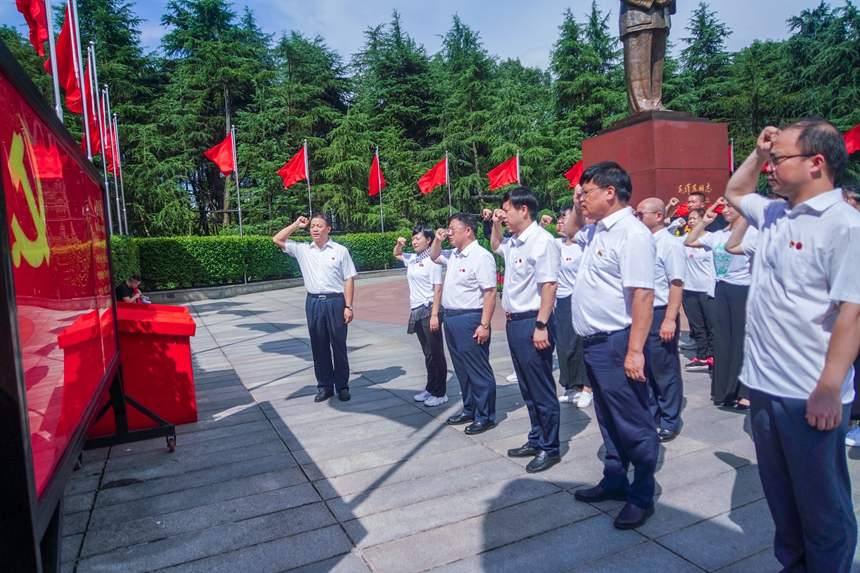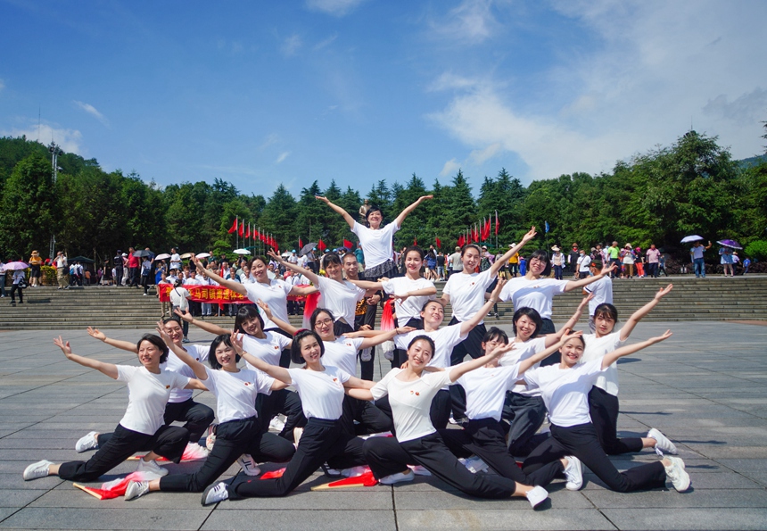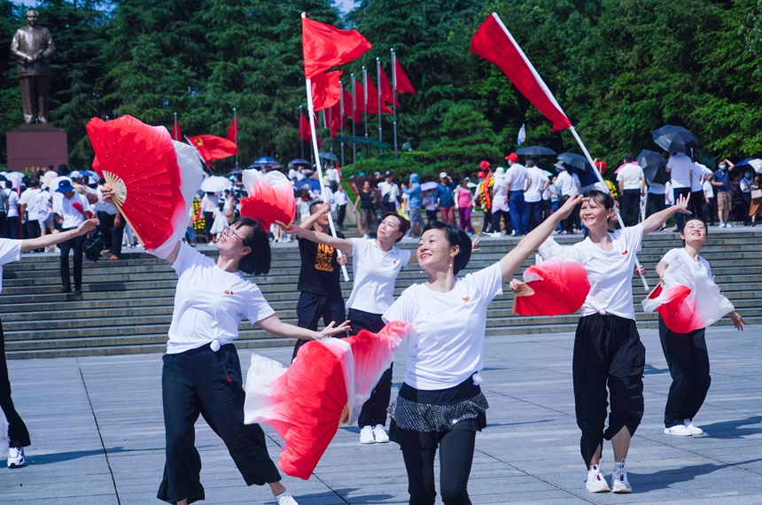 “太阳最红,毛主席最亲……”在铜像广场,党员同志们用一场别开生面的红心向党红色“快闪”活动,手持红扇舞出舞出对祖国的热爱与祝福,手持红旗讴歌中国共产党成立101周年来取得的辉煌成就。