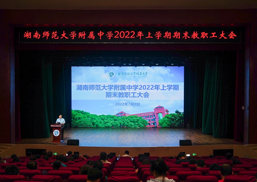 新闻中心 附中新闻 通知公告 最新动态 教育视点 集团学校新闻联播 媒体附中 工作安排 微信附中 学校召开2022年上学期期末教职工大会 发布:管理员 来源:未知 日期:2022-07-11 人气:分享到: 7月9日下午,2022年上学期期末教职工大会在学生活动中心召开。校长谢永红,党委书记黄月初,副校长陈迪勋、苏建祥等校领导出席会议,全体教职工参加了会议。会议由谢永红主持。 首先,谢永红宣读了学校中层干部任免决定,公布了下学年年级主任、教研组长聘任名单。 随后,陈迪勋回顾总结了过去一学年的后勤与保卫工作,强调了暑期安全工作。苏建祥全面总结了教育教学工作所取得的突出成绩,并就暑期疫情防控提出了明确要求。课程与教学处主任黄宇鸿通报了下学年教学人员安排情况。 最后,谢永红作总结讲话。他对上学年学校的工作和取得的成绩给予了充分肯定,对全体教职工的辛勤和智慧的付出表示感谢。他强调,全体教职工们在暑期要做到疫情防控不放松、师德师风要严守、安全之弦要紧绷、学习休养须兼顾、假期活动重效果,并祝大家度过一个安全、愉快、充实、幸福的暑假。 (供 稿:校办公室 审 核:莫 晖 编 辑:文 婷) 上一篇:我校开展第三届青年名师培养对象集中研修活动 下一篇:学校召开2021-2022学年度第二学期安全工作会议 通知公告 更多 关于开展“科研优秀奖”评选活动 湖南师大附中2025-2026学年度第一学 湖南师范大学附属中学2025级新生 湖南师范大学附属中学大泽湖校区 2025年湖南省基础教育教学成果奖 湖南省教育厅关于开展2025年湖南 最新动态 更多