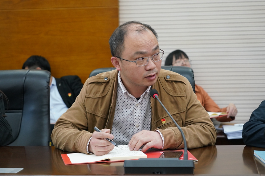 自由发言阶段,工会副主席伏炎安、团委副书记温宇分别从自己工作角度出发,谈如何将习近平新时代中国特色社会主义思想融入日常。