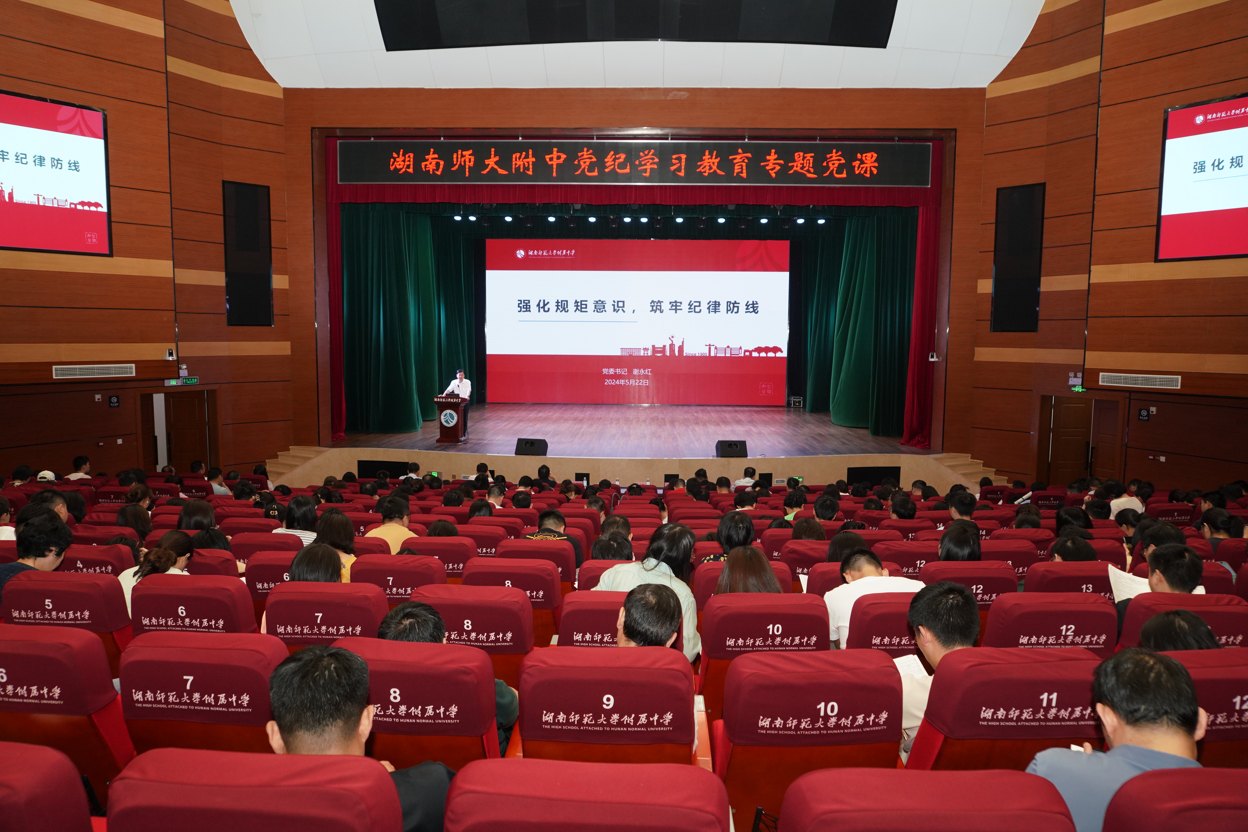 新闻中心 附中新闻 通知公告 最新动态 教育视点 集团学校新闻联播 媒体聚焦 工作安排 微信附中 学校开展党纪学习教育专题党课 发布:管理员 来源:未知 日期:2024-05-24 人气:分享到: 5月22日,学校开展党纪学习教育专题党课,党委书记谢永红为全体教职工讲授以《强化规矩意识,筑牢纪律防线》为题的专题纪律党课。党委委员、纪检书记李春莲主持。 谢永红从理解《条例》修订意义,坚定信念筑牢防线;深学《条例》修订内容,逐条对照防患未然;抓好《条例》贯彻落实,党纪教育入心见行三个方面深入阐述党的纪律建设。他要求,全体教职工要从思想上重视、行动上落实,做到思想锤炼从严、工作标准从严、作风养成从严、自我约束从严,使铁的纪律成为日常习惯和自觉遵循,切实在办人民满意教育的工作目标和为党育人、为国育才的初心使命中强化规矩意识,筑牢纪律防线。 (供稿:党委办公室 审稿:吴卿 编辑:文婷) 上一篇:我校国家基础教学成果奖成果在第八届长株潭教育科研交流活动中展示推广 下一篇:学校开展5·20青年教职工团建活动 通知公告 更多 湖南师范大学附属中学2024年度废 湖南师范大学附属中学化学实验室 湖南师范大学附属中学出国(境) 关于开展2024年暑假教科研论文评 湖南师范大学附属中学2024年暑假 关于申报“十四五”课题2024年度 最新动态 更多