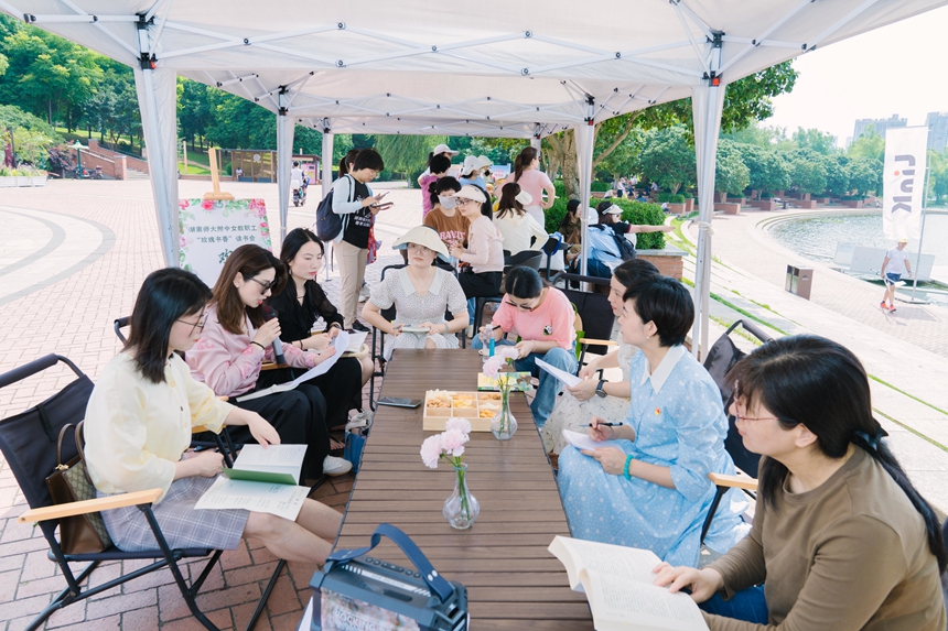 麓山如黛,湘水似锦。夏日美如画,读书正当时,利用拓展活动的间隙,我校“玫瑰书香”女教职工读书会还在西湖公园举行了一场读书分享会。我校纪检书记、湖南省“芙蓉领读者”李春莲老师带领各工会组的女教职工代表在风和日丽中进行了一场深度阅读和心灵的碰撞。