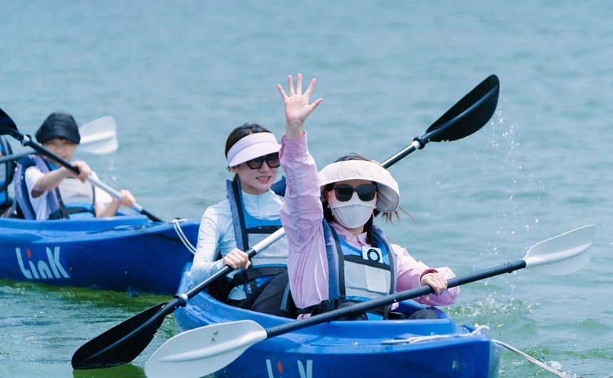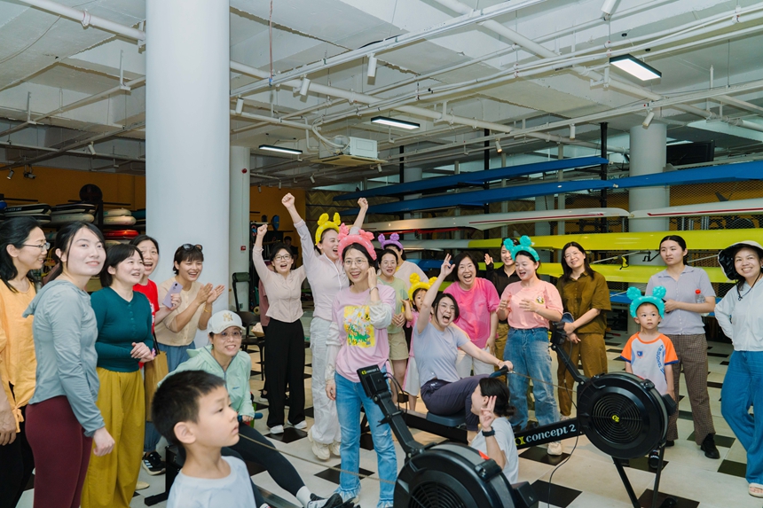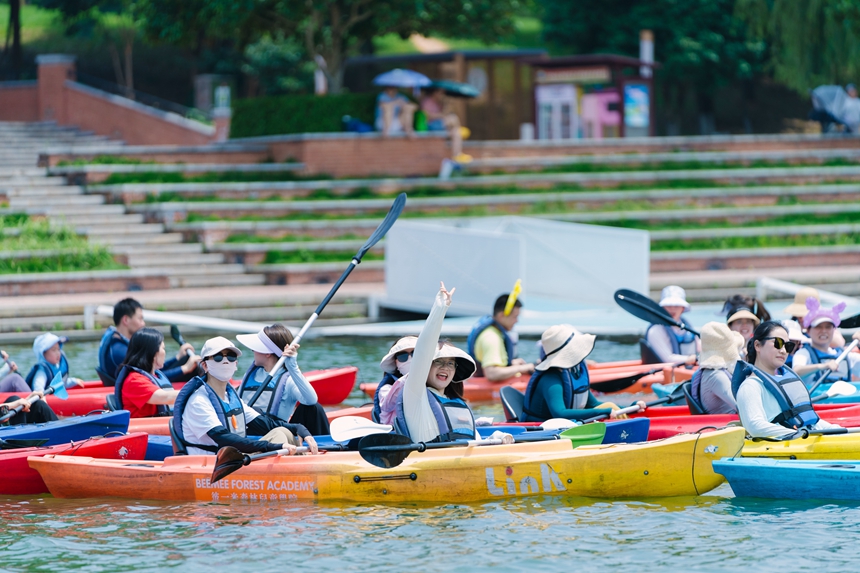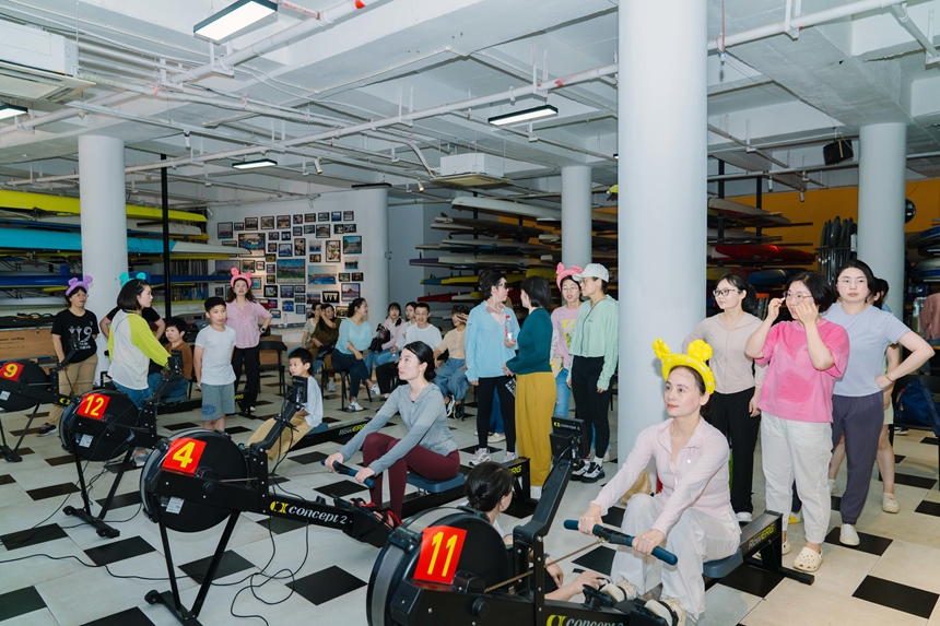 在明媚的阳光下,“女神”们热情高涨,在破冰互动和热身活动之后,积极参加旱地冰壶、陆地划船机、水上皮划艇等比赛项目。大家通过自由组队分成5个竞赛小组,通过团队竞技积分、水面绕桩接力等比赛形式,进行团队配合、体能挑战, 展开了热烈的团队比赛。在竞相追赶的热烈氛围中,各组团结一心、勇于挑战,充分发扬体育竞技精神和团队协作能力,通过酣畅淋漓比赛活动,每一位老师都收获了坚持、向前、协作、奋进的积极体验。