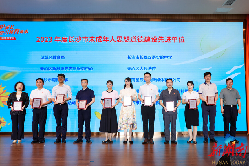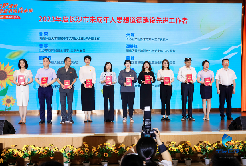活动现场为2023年度长沙市未成年人思想道德建设典型案例、先进工作者、先进单位进行颁奖。我校文明办主任鲁荣获2023年度长沙市未成年人思想道德建设先进工作者荣誉称号。