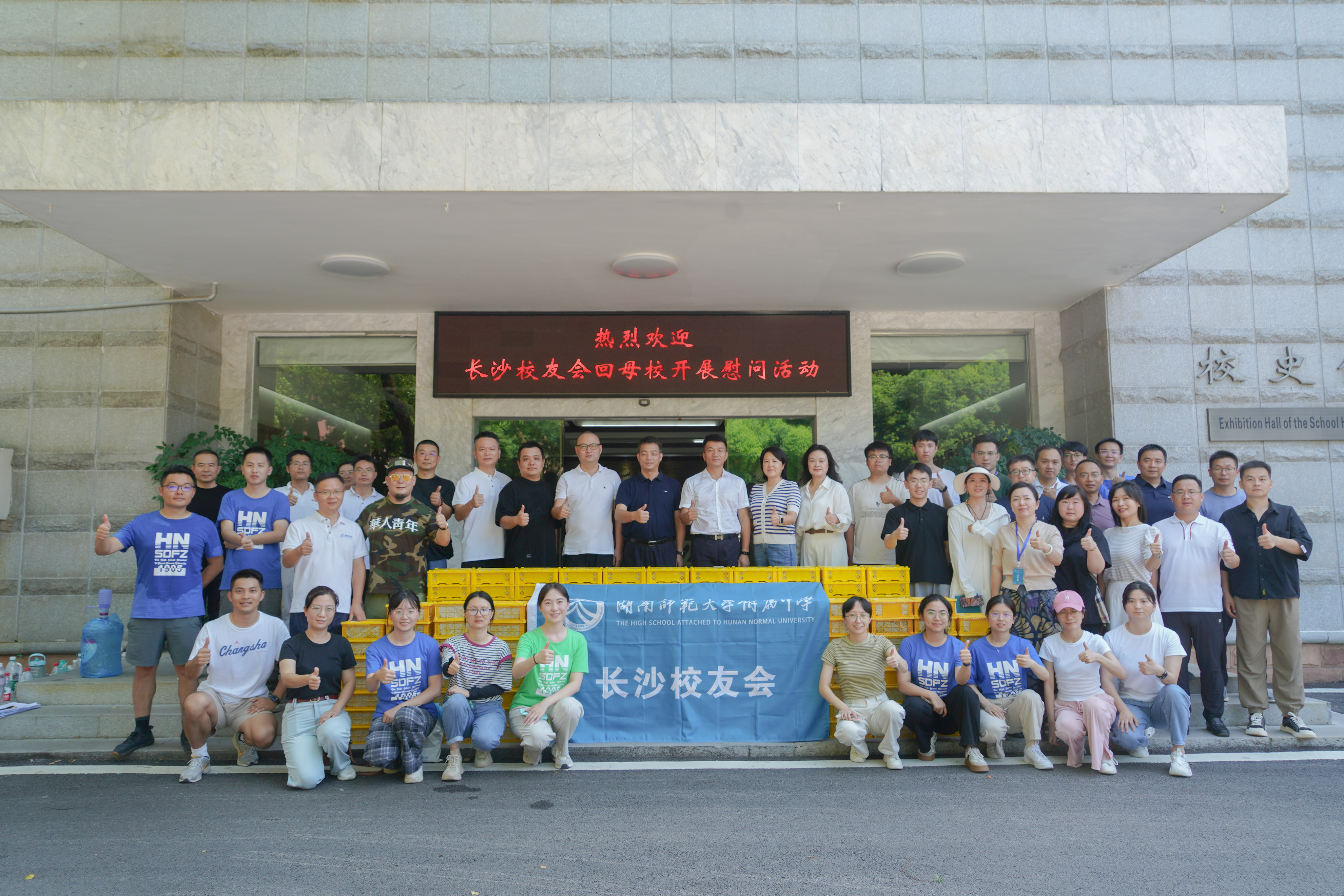新闻中心 附中新闻 通知公告 最新动态 教育视点 集团学校新闻联播 媒体附中 工作安排 微信附中 长沙校友会慰问军训的教官和师生 发布:管理员 来源:未知 日期:2024-08-24 人气:分享到: 8月24日上午,长沙校友会会长江峦,秘书长田晓萍,副会长杨奇乐、万路、谭伟宏、刘双,副秘书长何成、刘宇、何芳、周雄等一行回到母校慰问军训教官和师生,学校副校长苏建祥、副校长兼工会主席廖强热情接待了长沙校友会校友们一行,苏建祥向长期以来对学校工作给予大力支持的长沙校友会表示衷心的感谢。 军训团教官代表向江峦一行详细介绍了目前学校2024级高一与七年级年级新生“军营生活体验”的总体情况。随后,苏建祥、廖强带领校友们一行慰问各班师生、教官、老师,对大家的辛勤工作与2024级高一年级和七年级全体学生朝气蓬勃、奋发向上的精神风貌表示感谢和赞许。 时当末伏,暑气愈隆,长沙校友会还为各班班主任及教官送来水果,给炎炎的夏日带来了丝丝凉意。廖强代表学校向长沙校友们表示感谢。 (供稿:校友会 审稿:谭伟 编辑:文婷) 上一篇:青春向党 戎装启航——2024级学生“军训实践活动”开营仪式 下一篇:省直机关“湘直亲子·相约附中”研学实践活动在我校举办 通知公告 更多 关于开展“科研优秀奖”评选活动 湖南师大附中2025-2026学年度第一学 湖南师范大学附属中学2025级新生 湖南师范大学附属中学大泽湖校区 2025年湖南省基础教育教学成果奖 湖南省教育厅关于开展2025年湖南 最新动态 更多