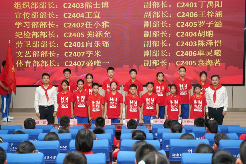 德育与学生发展处副主任蔡毅宣读新一届大队委员会名单,谢永红和廖强与新一届大队委合影留念。