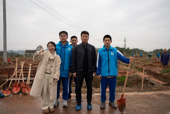 副校长廖强、德育与学生发展处副主任蔡毅、团委副书记谢小超、少先队辅导员张冰洁以及教工团支部黄依婷老师和高一高二的“蓝精灵”志愿者们。抵达植树基地后,大家立即投入到热火朝天的植树活动中。四人一组分工协作,或挥锹铲土,或扶苗培土,或提水浇灌,现场洋溢着欢声笑语。转眼间,一排排新栽的树苗昂然挺立,一块块护绿标语牌点缀其间。成片的树苗整齐排列,在春风中舒展身姿,沐浴着春日暖阳,焕发出勃勃生机。据介绍,此次种植的是助力村集体经济发展的"帝柚"树苗。去年也是由我校师生栽种的帝柚长势喜人,让同学们对亲手栽种的小树苗未来结出硕果充满期待。通过这次活动,同学们不仅体验了劳动的乐趣,更深刻理解了植树造林的意义和价值。