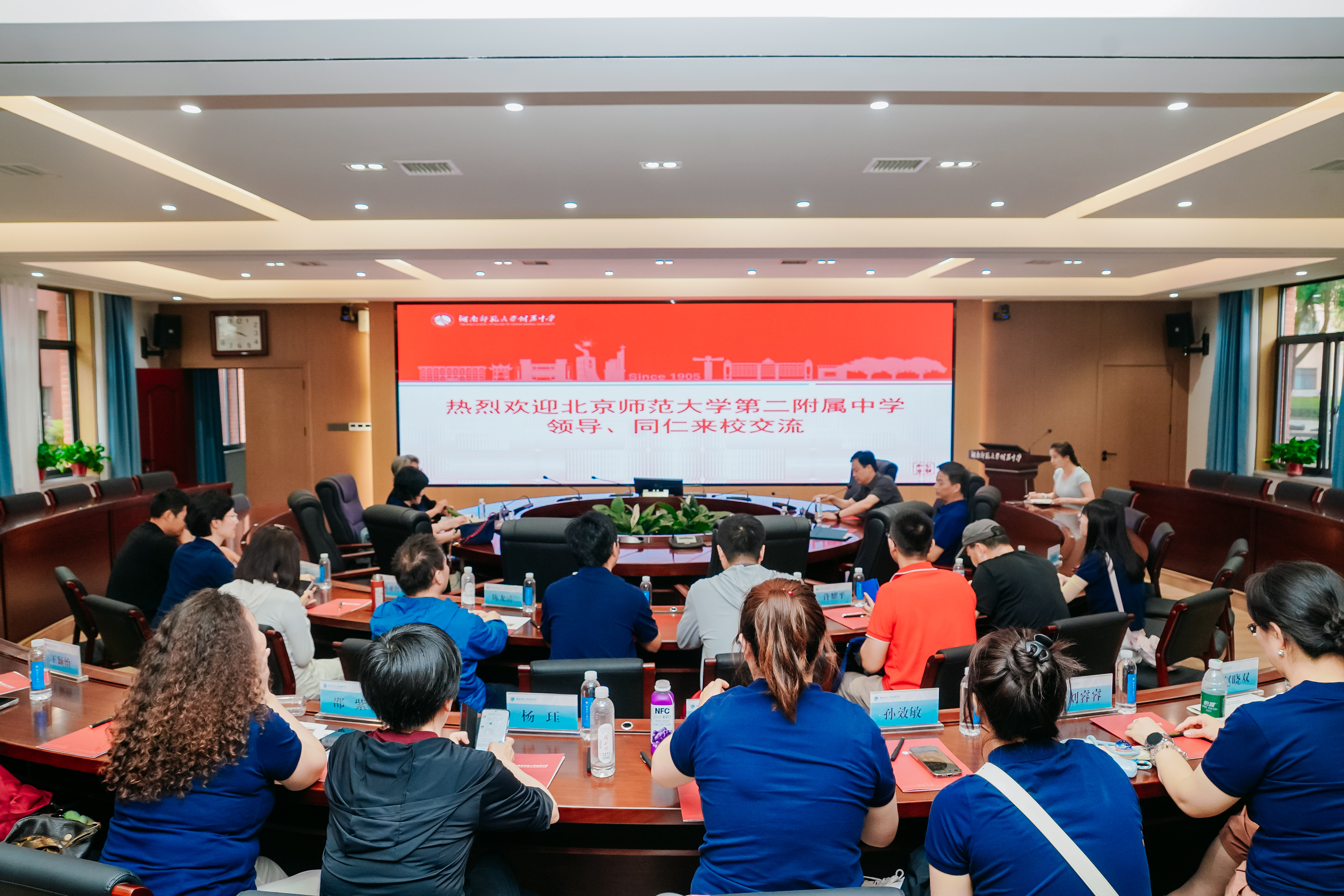 交流会上,谢永红对客人们的来访交流表示诚挚的欢迎。他表示,北师大二附中是我国基础教育的引领者,期待两校以此次交流为契机,在拔尖创新人才培养、教师队伍建设、集团办学管理等领域加强互鉴,共同推动人才培养质量提升和学校高质量发展。苏建祥、课程与教学处主任陈淼君、教育集团办公室副主任李海汾分别围绕 “拔尖创新人才培养”“教学管理与教师发展” “集团办学管理”主题分享实践经验。互动交流中,双方就主题相关的具体问题展开深入探讨,在教育理念与管理模式上形成诸多共识 。