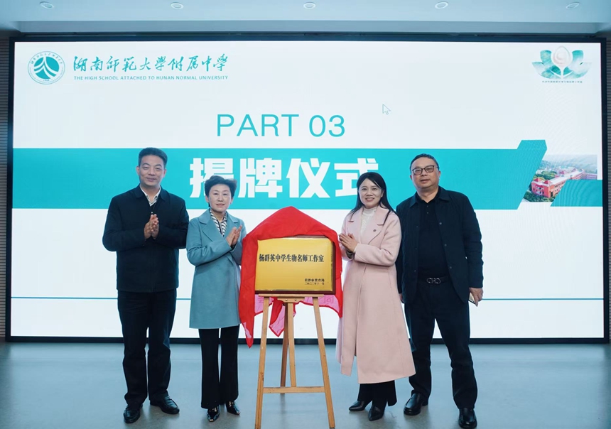 新闻中心 附中新闻 通知公告 最新动态 教育视点 集团学校新闻联播 媒体附中 工作安排 微信附中 长沙市杨群英中学生物名师工作室启动仪式暨首次研修活动在我校举行 发布:管理员 来源:未知 日期:2025-12-05 人气:分享到: 2月4日,长沙市杨群英中学生物名师工作室启动仪式暨首次研修活动于我校顺利举办。长沙市教育局党委副书记、副局长邓芸、教师工作处处长李峰,我校校长苏建祥等领导到场,工作室全体成员参与活动。 苏建祥致欢迎辞,他承诺我校将从多方面为工作室提供保障,期待其成为全市生物教师专业成长重要平台;邓芸副局长肯定工作室往届成效并提出新要求,明确教育局将给予政策与经费支持,希望其成为生物教育 “智囊团” 与 “孵化器”;李峰处长宣读工作室成立及聘任文件,与会领导共同为工作室揭牌并为顾问、名师团队颁发聘书。杨群英作为首席名师作履职表态,学员代表吴俊文也表达了学习成长的决心。启动仪式由我校副校长陈胸怀主持。 首次研修阶段,杨群英梳理往届成果并阐述新周期工作规划,工作室顾问曾峰作《如何做研究型教师》专题报告,活动还为上届优秀成员颁发结业证书。仪式后,全体人员合影并开展小组破冰活动,凝聚团队合力。 此次活动标志着工作室新征程开启,未来其将在市教育局指导与我校支持下,助力打造高素质生物教师队伍,为提升长沙中学生物教育教学水平赋能。 上一篇:我校八年级师生赴张家界民族中学开展助学实践活动 下一篇:我校召开2025-2026学年度第一学期教育教学半期工作总结会议 通知公告 更多 关于征集湖南师大附中“十五五” 湖南师大附中2026年教师招聘(第 关于开展2024-2025学年度科研成果评 湖南师大附中2026年教师招聘(第 湖南师大附中2025年教育教学成果 湖南师范大学附属中学2025年零星 最新动态 更多