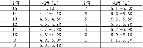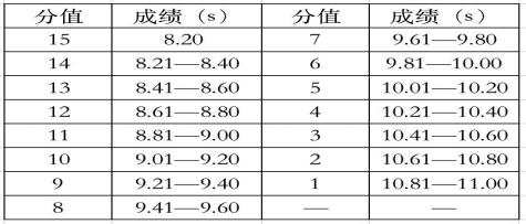 (1)考试方法:受试者 2 人一组,站立在起跑线后。受试者当听到起跑信号后,立即起跑,冲刺过终点线,测试人员记录通过终点的时间,以秒为单位,精确到小数点后2位。