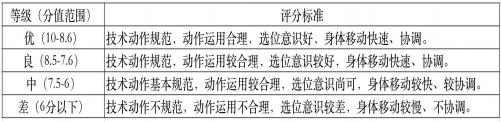 (2)评分标准:考评员参照实战能力评分细则 (见下表),独立对考生的技术能力 、战术能力、心理素质以及比赛作风等方面进行综合评定 。采用 10 分制评分,分数至多可到小数点后一位。