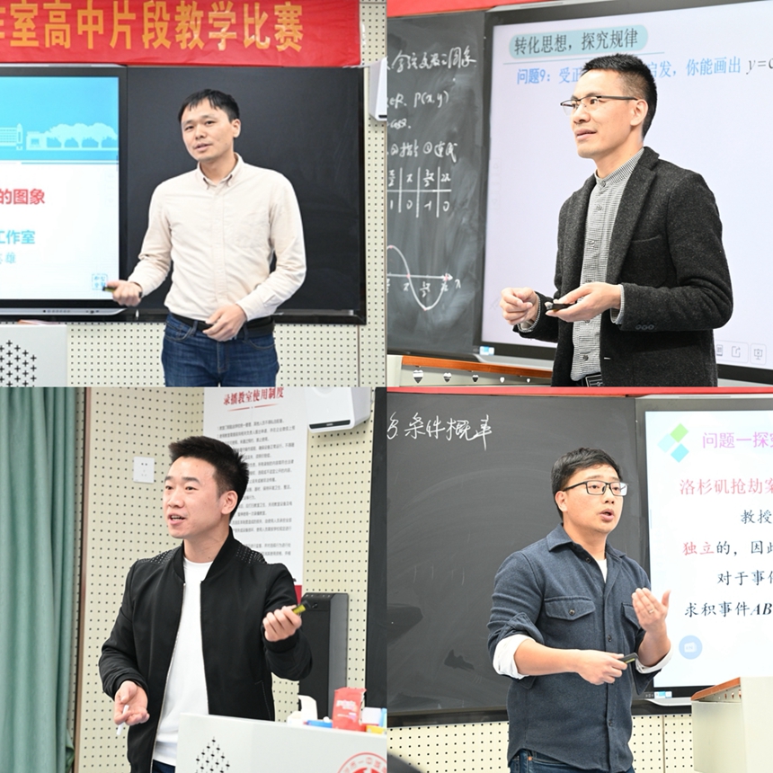为了提高教师的业务能力,促进教师专业发展,工作室举办了此次高中数学片段教学比赛。张志雄老师和伍刚参赛的课题是《5.4.1正弦函数、余弦函数的图象》。张老师从定义出发探究正弦函数的图象,通过八等分、十六等分、三十二等分0到2π这个区间得到正弦函数的图象的轮廓,之后在这个图象上选取五个关键点,使学生能够通过“五点法”迅速准确地做出正弦函数的图象。伍老师用摩天轮视频引出课题,引导学生探索画坐标系一个点到任意点,用滚动单位圆模型,细绳缠绕法在坐标系中找横坐标,平移正弦函数值找纵坐标等方法,突破了教学难点,并鼓励学生利用等分单位圆制定方案画正弦函数的图象,再用GeoGebra软件精准描点连线得到正弦函数图象。两位老师从教学内容解析、教学目标设置、学生学情分析、教学策略分析和教学过程设计等方面进行教学教学阐述。夏炎兵老师和田茂清老师比赛的课题为《7.1.1条件概率》。夏老师采用了“五有四化”主题式教学模式,通过引入生活情境,问题导学层层递进,最终回到解决生活实际问题上,让学生感受到所学内容有趣有用。田老师以洛杉矶抢劫案为情景引入,激发学生的学习兴趣,再从生男生女的概率问题,引出条件概率的定义,引导学生从实际出发,思考并学会解决生活中的实际问题。两位老师从教学目标设置、教学重难点分析、教学方法策略、教学过程与设计意图和课后评价与自主学习等进行教学阐述。