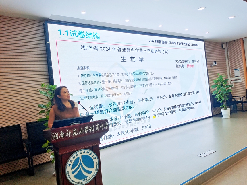高中会场继续在之谟图书馆报告厅进行,由长沙市一中城南中学彭敏林老师主持。来自工作室以及基地的11位老师就2024年湖南生物卷的试题进行说题展示,说题老师们从不同角度对高考真题进行了深入解读与剖析,启示老师们在生物学教学中,应如何把握高考命题方向,引领我们的教学,如何在“三新”背景下实现“教—学—评”一体化,真正立足于培养和发展学生的核心素养,落实立德树人的根本任务。接着,向阳老师通过对本校新高三学生2024年湖南高考试题答题情况的分析,得出了学生得分不高的“五不”原因,并提出了一轮复习对策。最后,首席名师杨群英老师对2024年湖南高考生物试题进行了整体分析,从试卷结构、主要考查的核心知识、不同模块考查分值分布、试题素材、试题情境等角度对全卷进行了简要分析,并突出解读了试题彰显学科特色、注重必备知识和关键能力考查、注重科学研究与农林生产实践中实际问题的解决能力的考查等特点。高考不断强化考试的育人功能,紧扣时代脉搏,培养时代新人,彰显五育并举,引导学生全面发展。