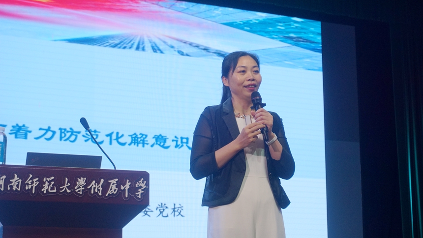 中共湖南省委学校吴音莹博士作了《新形势下着力防范化解意识形态风险》的专题讲座。她全面阐述了防范化解意识形态风险的重大意义,结合政策文件和大量生动案例,分析了我国意识形态领域面临的各种风险挑战,从强化意识、提高能力、完善机制等方面指出了着力防范化解意识形态风险的现实路径。她强调,中小学教师肩负为党育人、为国育才重大使命,必须始终把意识形态风险防范化解摆在突出位置,主动识变应变求变,有效应对严峻复杂的国际形势和接踵而至的风险挑战,为全面建设社会主义现代化国家、全面推进中华民族伟大复兴而团结奋斗。
