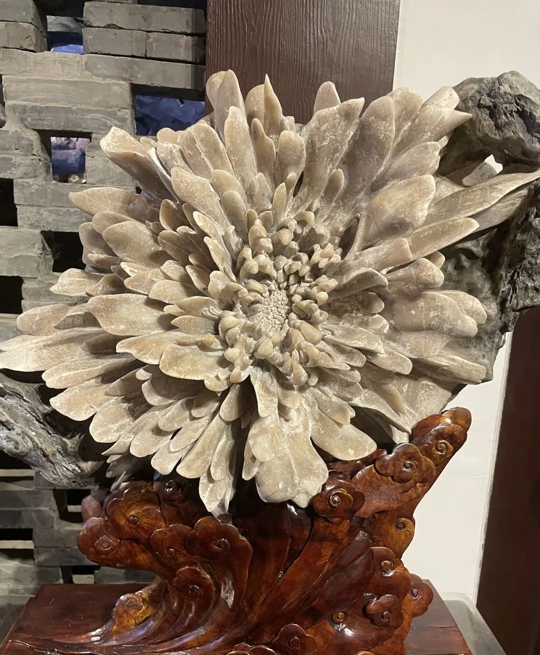 菊花石又名“石菊花”,是天然稀世珍品。湖南浏阳大溪河底盛产菊花石。其“花 ” 蕴育于二亿多年前,因地质运动而自然形成于岩石中。浏阳河一带的碳酸盐质沉积岩中的菊花石层位为下二叠统栖霞组。于沉积成岩作用后期碳酸钙(方解石)置换天青石形成形似菊花的放射状集合体。这些集合体的中心是坚硬的燧石,花瓣则保留了天青石晶体的斜方长柱状外形。