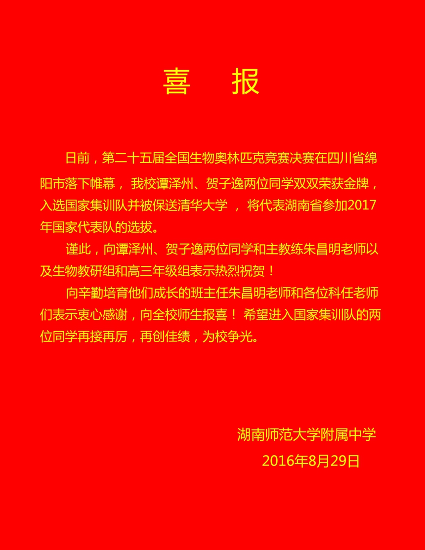2014级谭泽州、贺子逸入选生物奥赛国家集训队