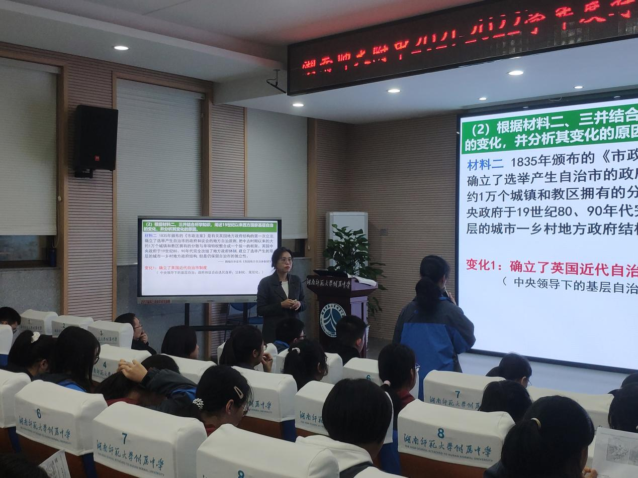 李珊老师在2019班执教的《西方主要国家的基层治理与社会保障》吸引了湖南师大附中集团校以及外校的众多老师前来听课学习。历史组教研组组长刘国彬主持了本次活动,教学发展处黄宇鸿主任与李勇主任全程参与活动,历史教研组全组成员参加并承担了接待活动。