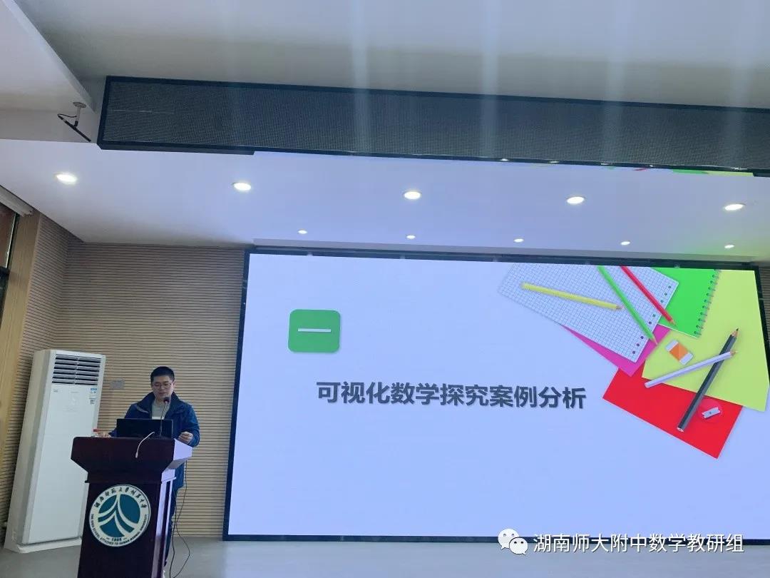 首先,湖南师范大学数统院中学数学教学研究员、长沙市信息化教学数学学科专家、长沙市望城一中郑柯老师来我校作了题为《可视化数学探究案例展示》的专题讲座。