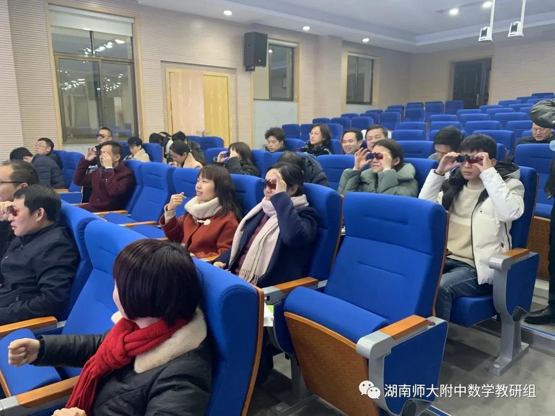 数学组全体与会老师们积极参与互动,用3D眼镜真切感受动态可视化数学模型。郑柯老师提到,裸眼3D技术不同于平面化的三维图形技术,它是一套交互形式丰富,仿真效果好,用户真实感强烈的可视化仿真系统。将这种技术应用于教学将会是一个令人兴奋的新课题。
